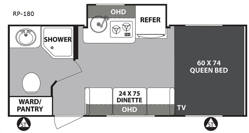 Get ready to travel just about anywhere with this lightweight R-Pod travel trailer! This model is ideal for any couple. There is sleeping space on the front RV queen bed, and the 24" x 75" booth dinette can easily convert into a sleeping spot for a child. The slide out along the roadside helps open up the floor space, plus you will find all of the kitchen amenities here. The spacious full bath in the rear has plenty of room to easily get ready for any adventure that lies ahead. You will also enjoy all of the exterior storage for all of your outdoor camping gear. This unit even includes a TV for movie nights!