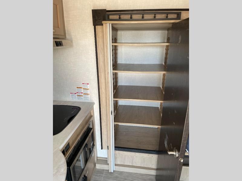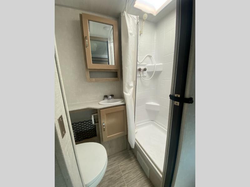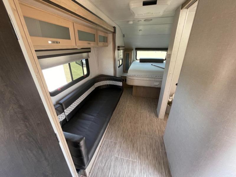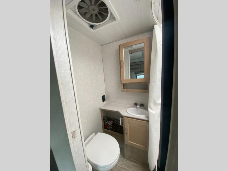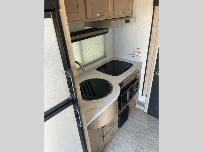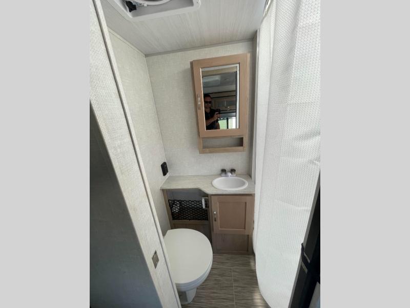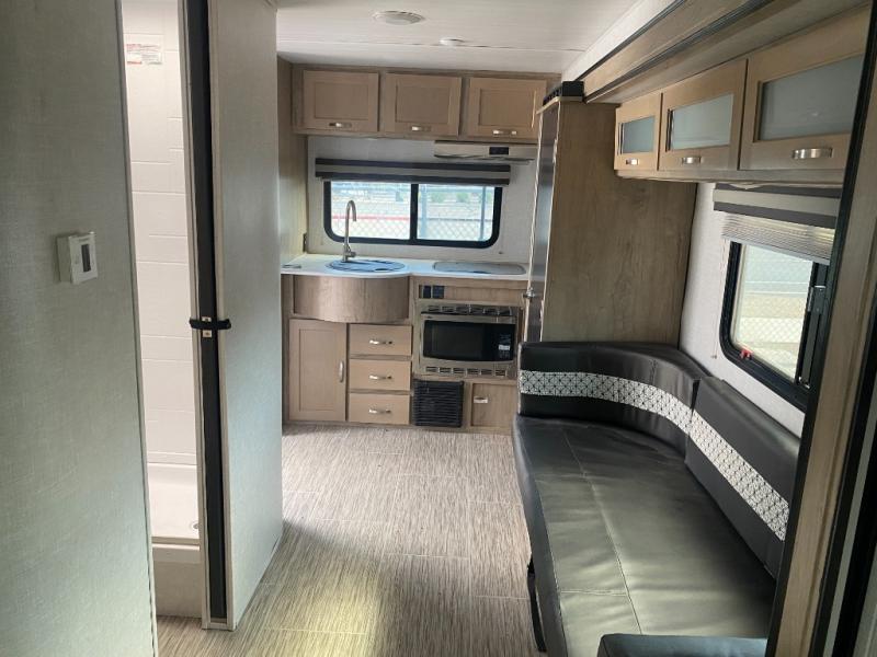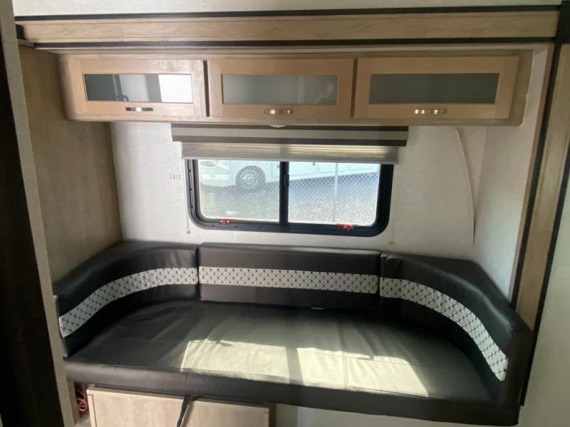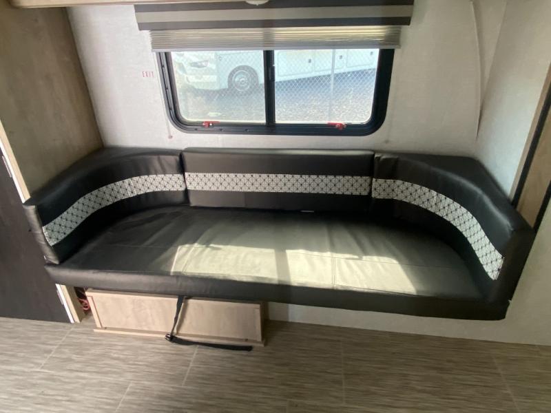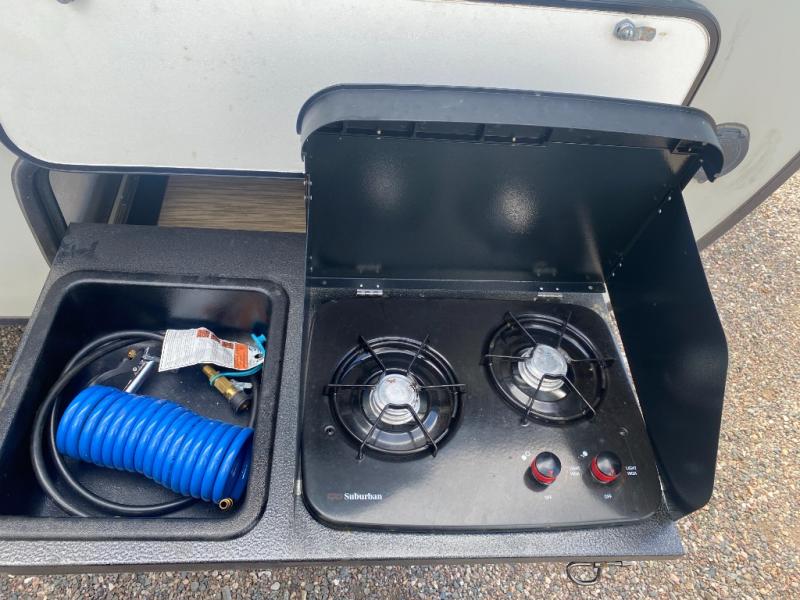 You are going to love waking up every camping weekend in this cute R-Pod travel trailer which features plenty of space and loads of storage for all of your things. The rear kitchen is unique and provides a large window above the stove top and sink so that you can feel like you are cooking right outdoors even on a day when the weather isn't perfect. The U-shaped dinette within the slide out provides more interior walking space, and it can easily be turned into an extra sleeping spot if needed. The front RV queen bed will allow you to wake refreshed for each new day of adventure, and you will appreciate the windows on each side for cross ventilation and a great view of your surroundings.