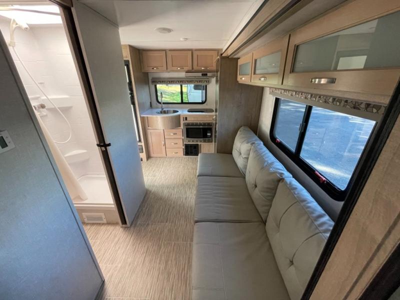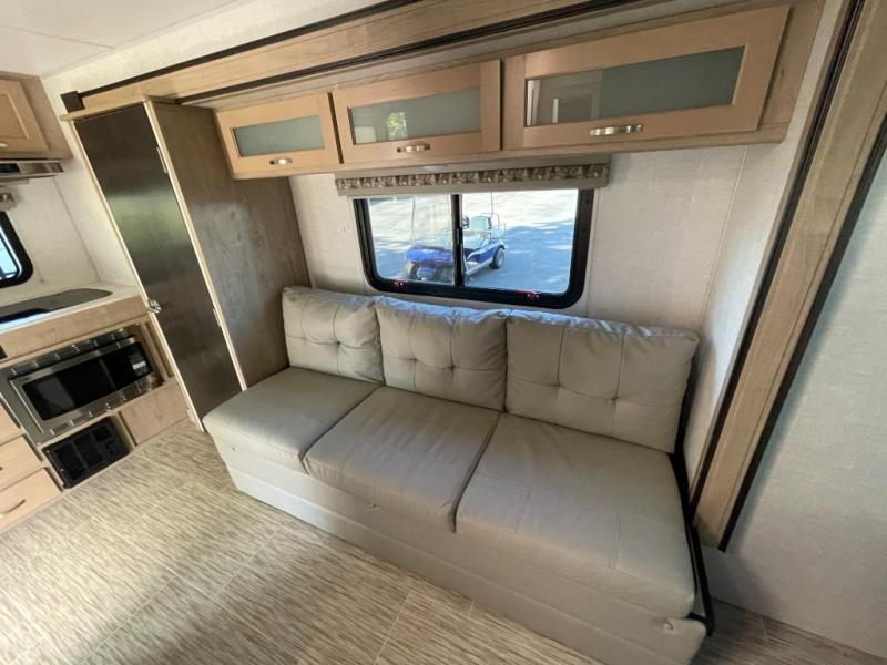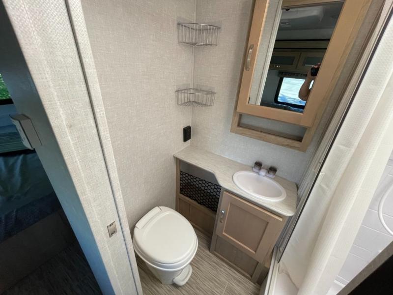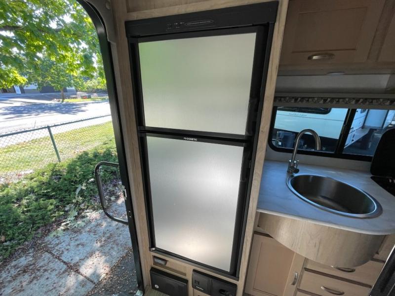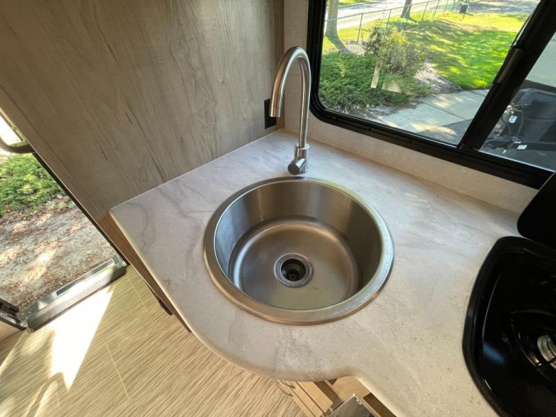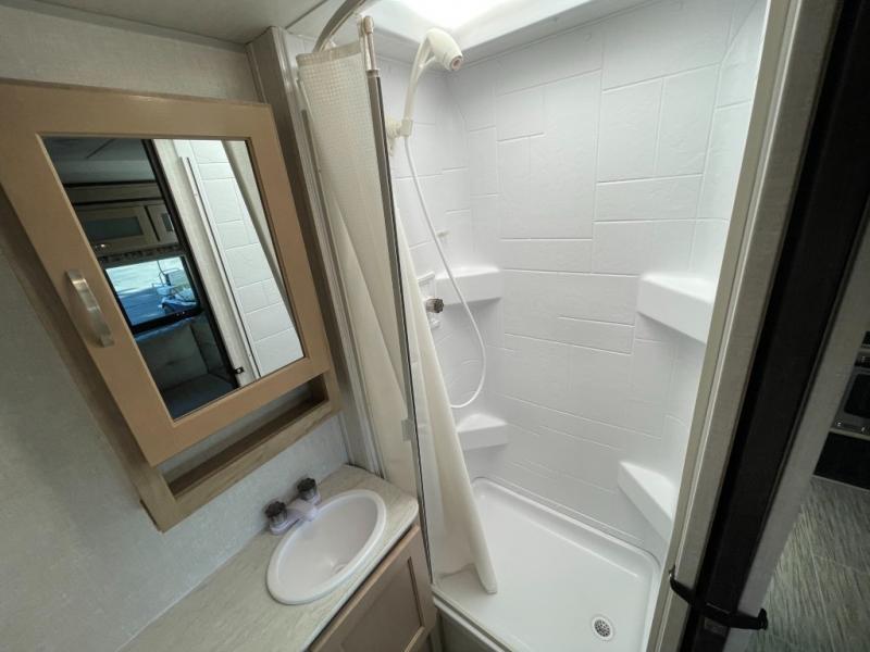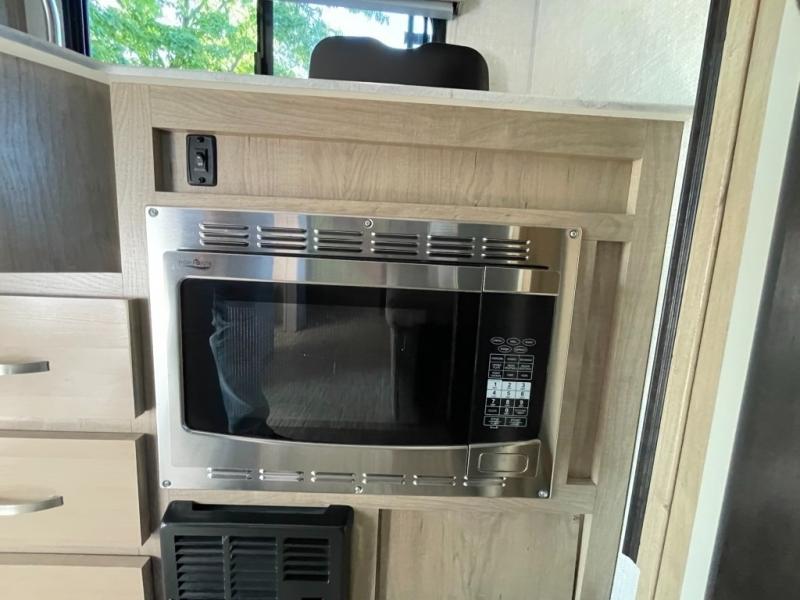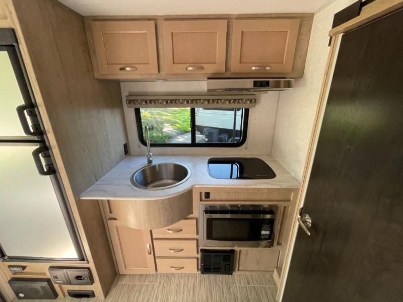 This is the perfect travel trailer for a couple or a smaller family, so pack your bags and get ready for an adventure in this R-Pod! After you've set up camp and had a look around the campgrounds, you can prepare lunch on the two-burner cooktop and in the convection microwave found in the rear kitchen. There is a convenient 6 cu. ft. refrigerator and a pantry as well to store your favorite snacks and perishables, plus overhead compartments for more items. The full bath allows you to skip the camp's facilities, and the exterior pass-through storage provides space for you to bring along the fishing poles!