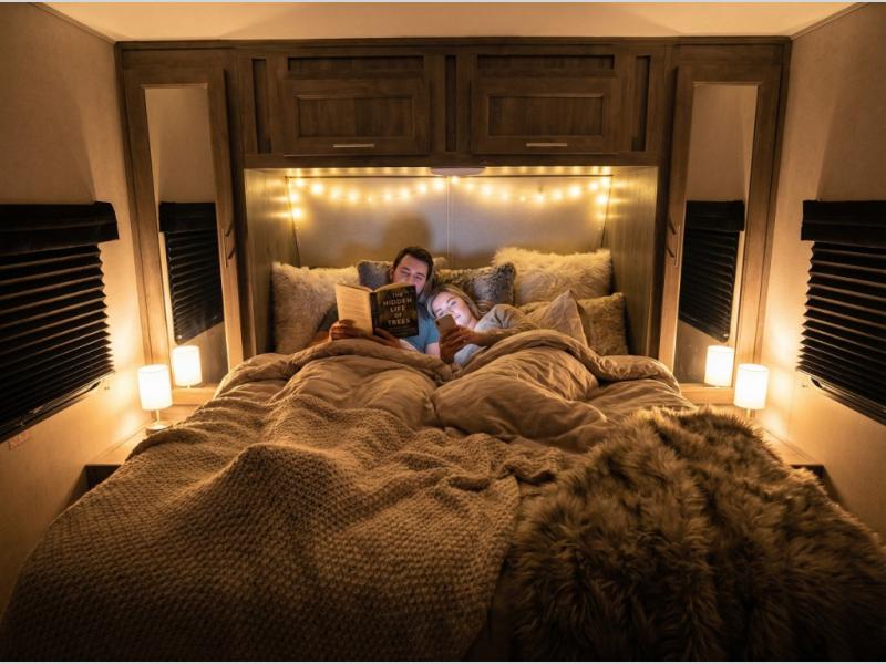 A True Master Retreat: The Front Queen Bed is a comfortable walk-around, offering easy access and extra storage surrounding it. No need to climb over each other!