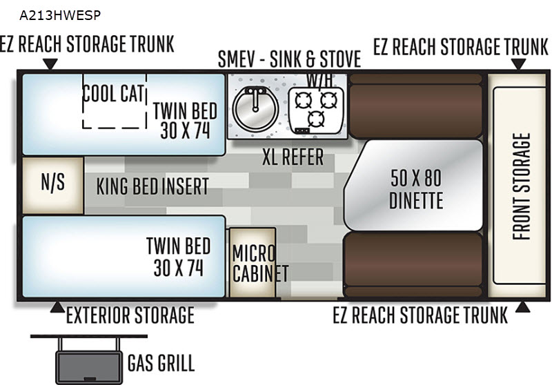 This Rockwood Extreme Sports Package Hard Side A-frame model A213HWESP by Forest River offers an outdoor gas grill with a worktable allowing you to be outside with your family and friends while grilling outdoors. You even have the option of cooking inside on the three burner range and with the microwave with a cabinet for your snacks, plus there is a sink for clean up. When it's time to retire for the night, the 2 twin beds and dinette provide a comfortable inside spot for 3 people. The exterior front storage allows a space for your outdoor gear, and the EZ reach storage trunks provide quick access to your items, plus there is storage inside as well.