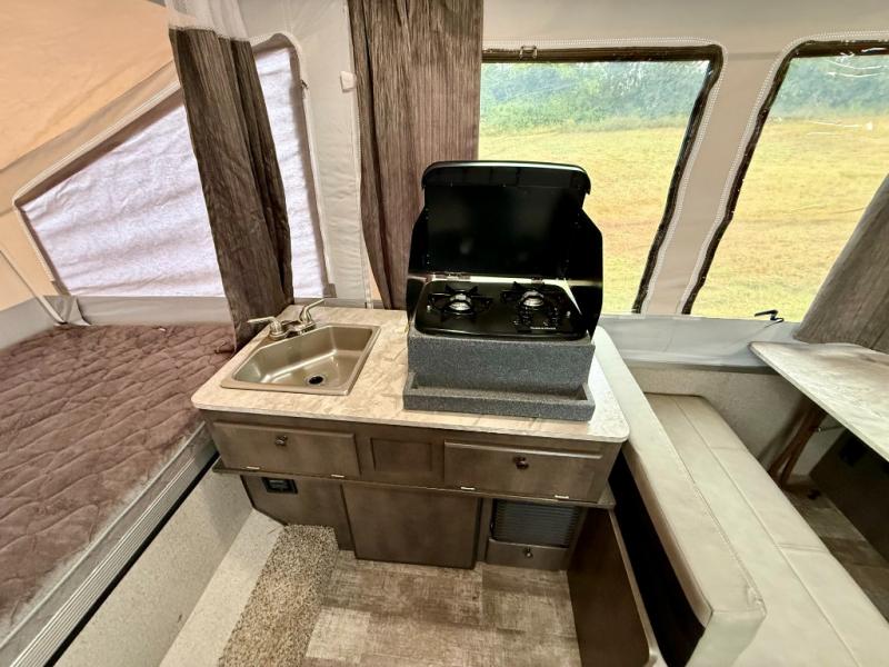 Take your small family on a fun adventure in this Rockwood Freedom Series folding pop-up camper by Forest River. Cooking dinner is made easy with the indoor kitchen, as well as the carry-out range. You can enjoy your meals either at the 40" x 74" dinette which can also be transformed into a sleeping space, or you can pull up a chair underneath the 9' awning. At night, you can choose to enjoy a good night's rest in either the front 60" x 80" tent bed or the rear 48" x 80" tent bed.