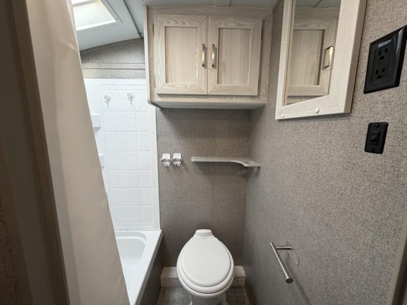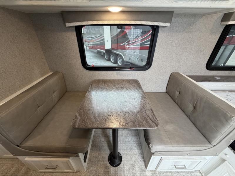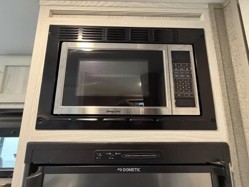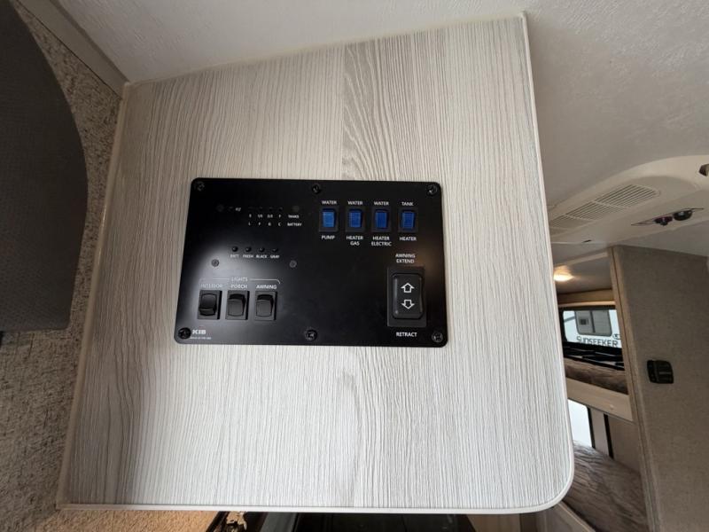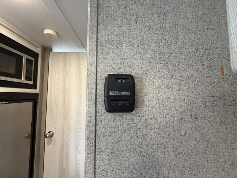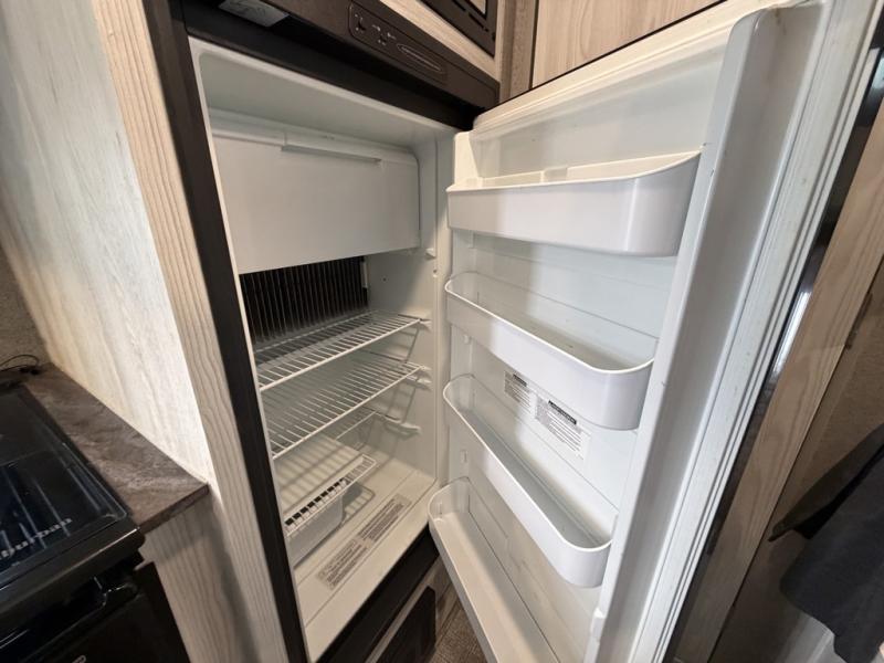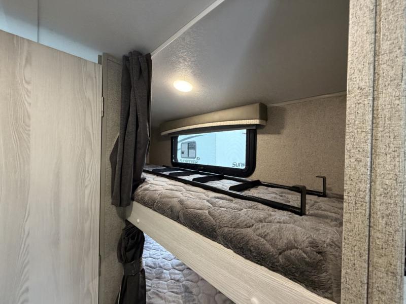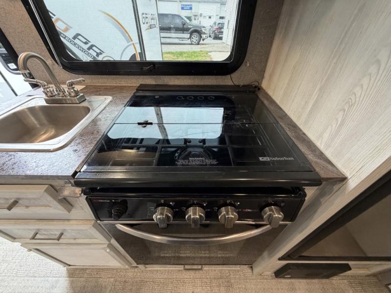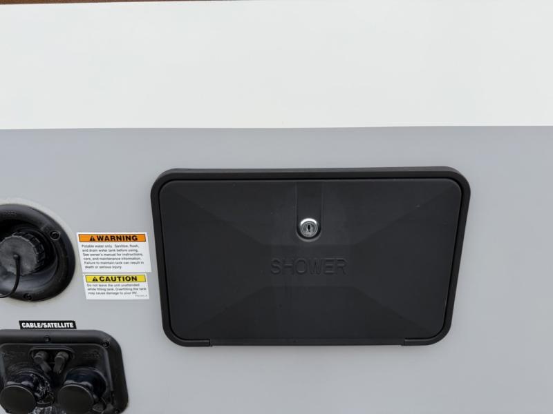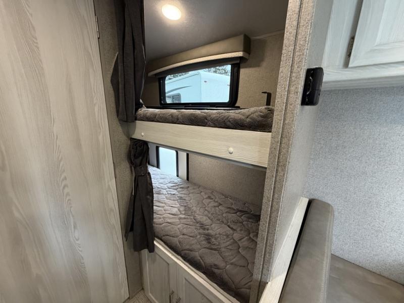 The set of bunk beds, the full-size bed, and the 32" booth dinette give this trailer the ability to sleep five people each night which means that you can bring the family with you as you hunt and fish or bike the trails. And the tub/shower in the private toilet room will be helpful for rinsing off the dirt and grime before supper. The kitchen provides everything you will need to make meals, and the outside gas griddle gives you another choice when cooking. You will love spending your evenings relaxing outside underneath the 13' power awning as you gather around the campfire and roast marshmallows together. You can stow away your grilling sticks and camp chairs in the exterior storage, and the bike door allows you to stow away a few things inside.