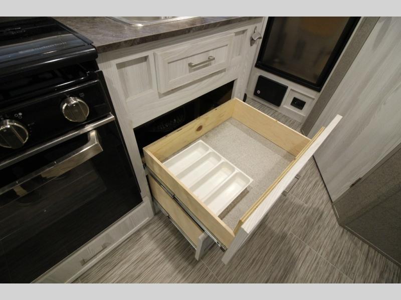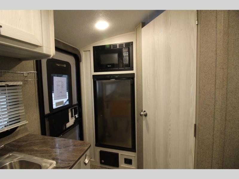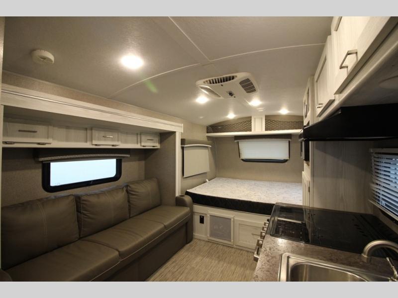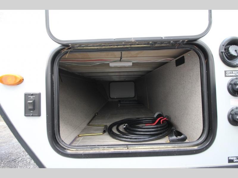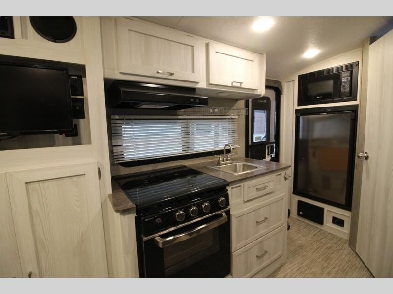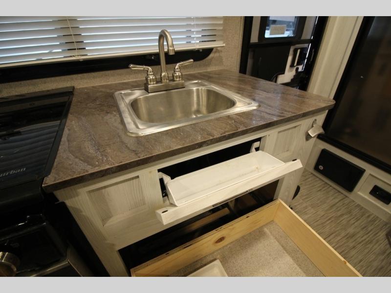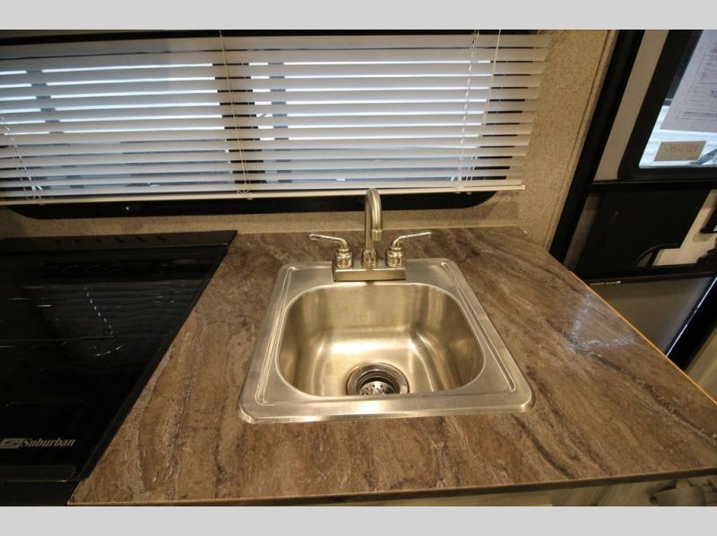 Come see just how fun and easy camping can be with this single slide sofa with cupholders and a table giving you more floor space between the front and the rear of the trailer to move about without having to squeeze in. The rear corner full bathroom is across from the entry allowing you quick access inside and back outside so that you don't have to miss anything. You can make meals in the kitchen area or outside on the gas griddle, watch the 12V TV, and sleep on the queen-size bed up front with overhead storage. You even have a handy exterior ladder on the rear if you need to check the top of the trailer sometime.