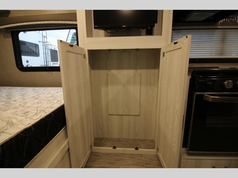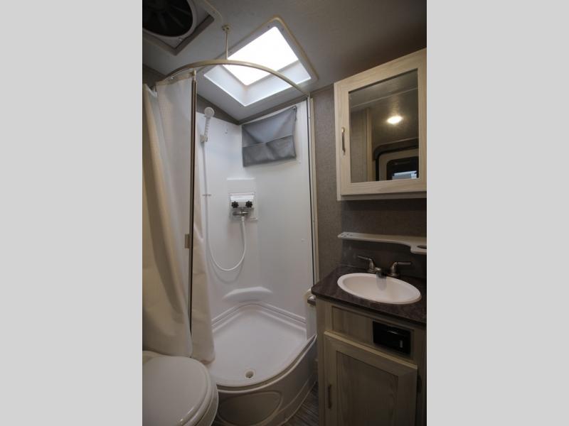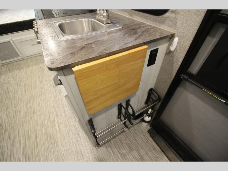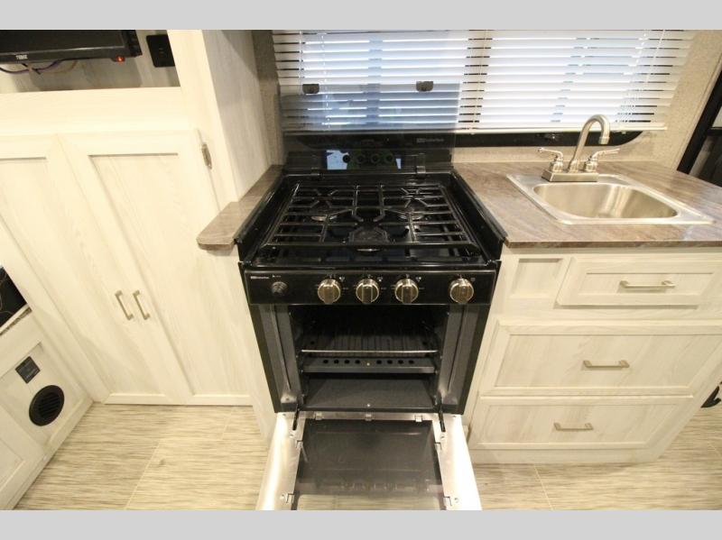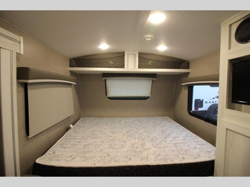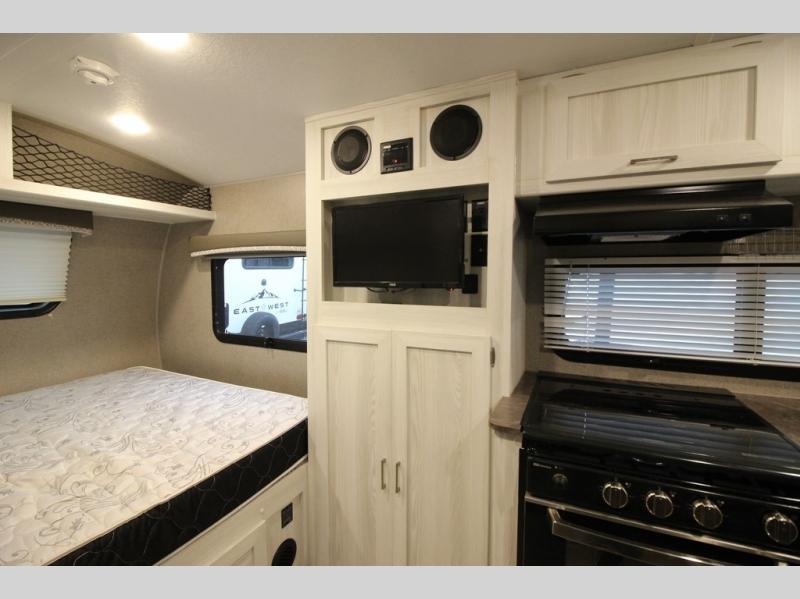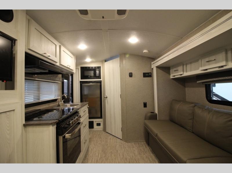 Come see just how fun and easy camping can be with this single slide sofa with cupholders and a table giving you more floor space between the front and the rear of the trailer to move about without having to squeeze in. The rear corner full bathroom is across from the entry allowing you quick access inside and back outside so that you don't have to miss anything. You can make meals in the kitchen area or outside on the gas griddle, watch the 12V TV, and sleep on the queen-size bed up front with overhead storage. You even have a handy exterior ladder on the rear if you need to check the top of the trailer sometime.