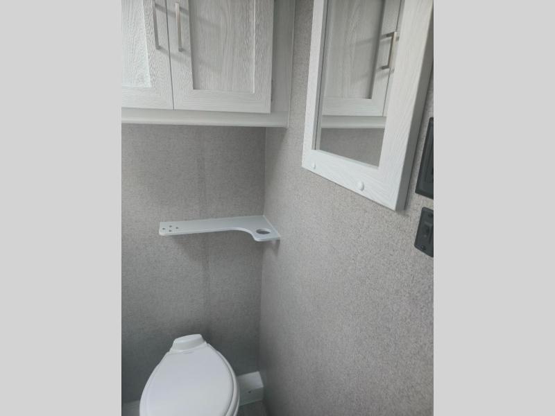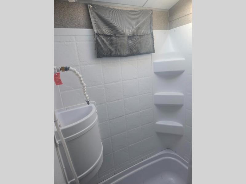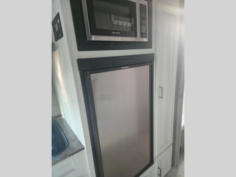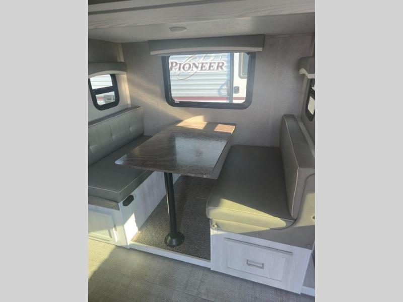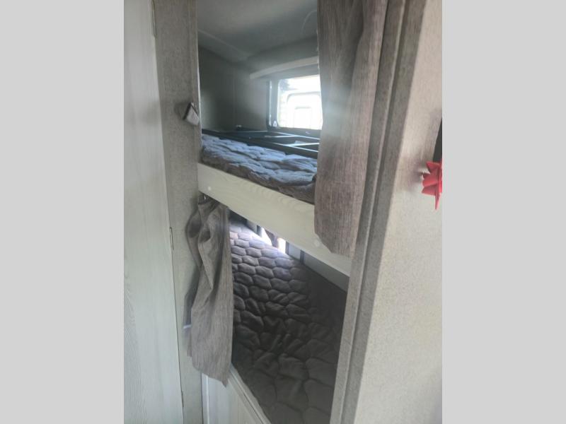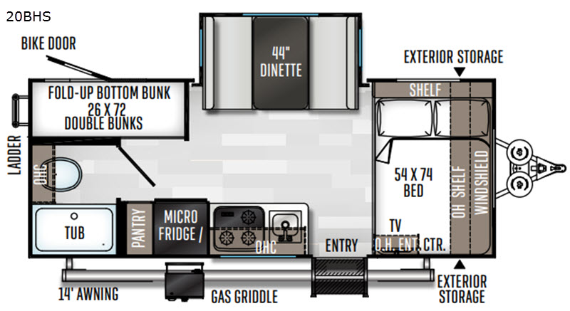 The kids will claim the bunk beds for themselves while you will have your own full-size bed up front next to the entry. The bottom bunk even folds up to be able to store a few items through the bike door to travel inside. You will find that 44" booth dinette slide offers more floor and sleeping space, plus dining. After the cook makes a meal in the kitchen which includes a pantry or on the outside gas griddle, you can play a game or visit while sitting at the dinette. You can also enjoy spending your evenings relaxing outside underneath the 14' power awning or by a campfire while telling each other stories about the day.