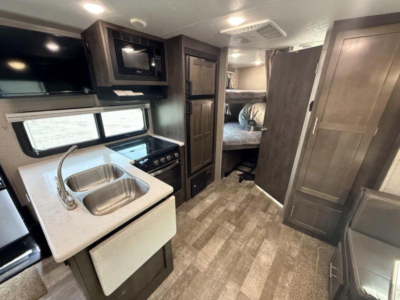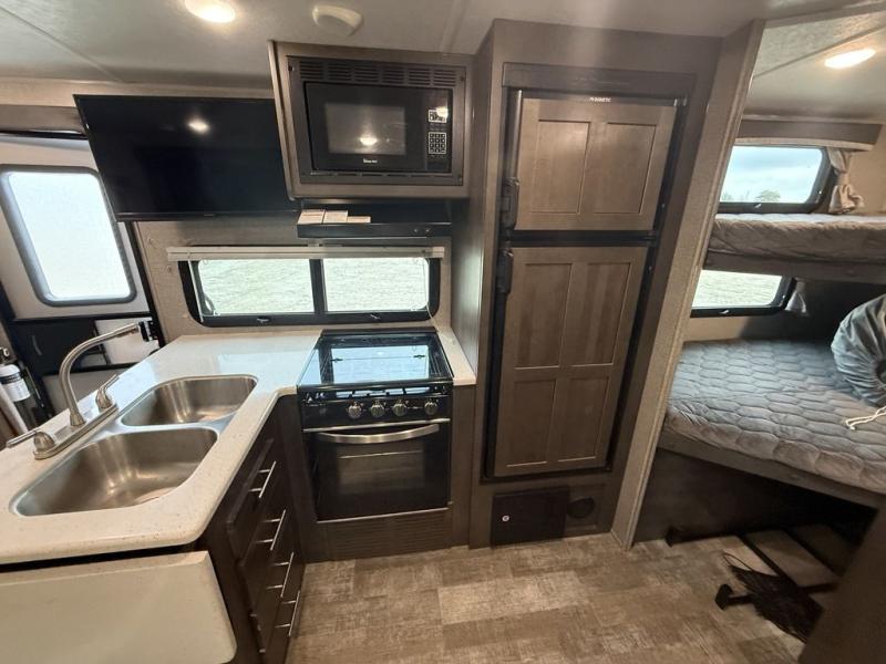 See just how fun and convenient camping can be in this single-slide Rockwood Mini Lite travel trailer by Forest River. You will love the double-size bunks and the exterior pull-out grill to grill up your best burger. If the weather doesn't allow you to use the grill, you can still easily whip up your best meal at the indoor kitchen, and the countertop extension is the perfect place to serve your meal. With the Murphy bed, you can enjoy a good night's rest as well as transform it into a sofa for extra seating during the day. You will also love the added convenience and privacy with the rear bath next to the bunks. Whatever you choose to do with your friends or family, it is sure to be a good time in this travel trailer!
