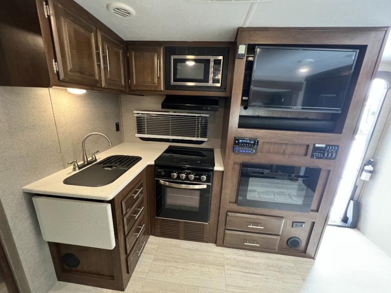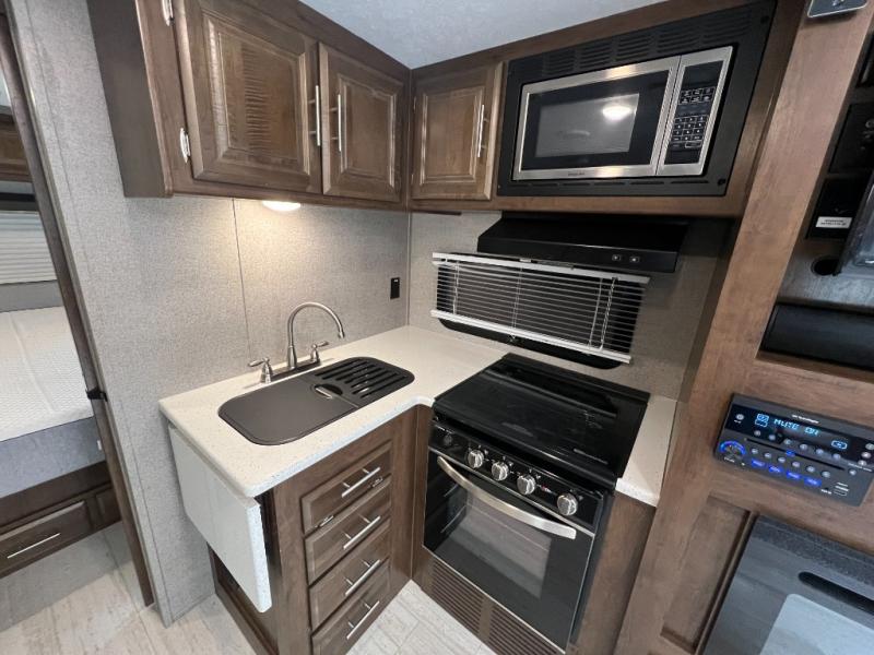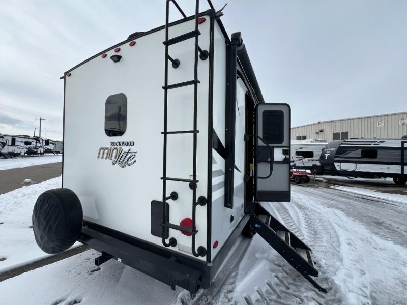 This Forest River Rockwood Mini Lite travel trailer has a front private bedroom which makes this unit the perfect couple's getaway! Whether you choose a secluded place in the woods, a campground, or a place by the beach, you are sure to love your vacation. The two slide outs provide plenty of walking space in this unit, and you can relax to the fullest with the heated theater seats that have cup holders and USB ports. You will also love the convenience and added privacy of the rear bath which has a linen closet for you to keep your linens handy. You can whip up your best meals with ease whether you choose to do so indoors or outdoors on the gas grill, and you can conveniently serve them on the kitchen countertop extension. There is even a 17' power awning with LED lights to protect you from getting a sunburn and allow you to see clearly at night.