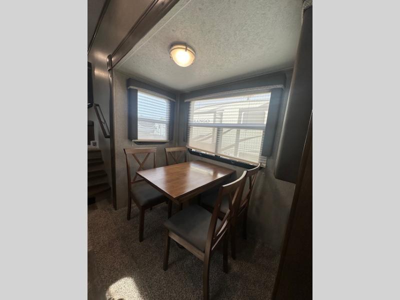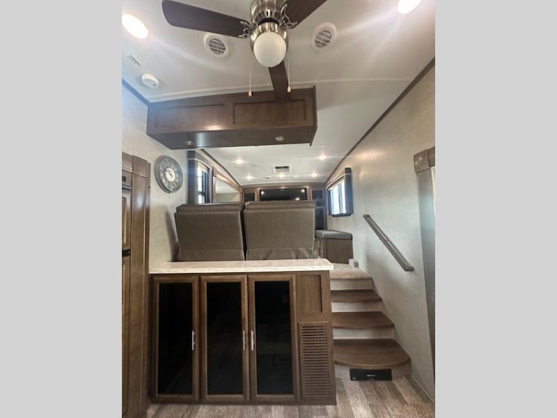 See just how easy and fun camping can be with this fifth wheel with four slide outs. Straight in from the door is the bathroom where you can easily get ready for your day. The rear bedroom is a spot where you can find comfort and rest. Here, you'll find a Serta queen bed, a large wardrobe, and you can add an optional TV. The kitchen area features dual opposing slide outs and plenty of room to move about while you fix your meals, plus a counter peninsula. In the evening plan to retreat to the front living area where you can watch your favorite movie or show at the large entertainment center, plus there is a fireplace which is nice for those chilly evenings. Within the roadside slide out there is a 60" hide-a-bed sofa where your kids or guests can sleep at night. This fifth wheel also includes a mini outside kitchen the chef of the family will love!