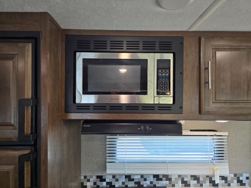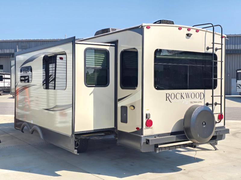You won't believe how many awesome conveniences have been included in this Rockwood Ultra Lite travel trailer! The large slide opens up the main living area so that you can have a great time with friends gathered on the 67" hide-a-bed sofa, the 44" booth dinette, and the two swivel rockers with end tables. In the kitchen, the chef will have a great time preparing dinner because the countertop extension will add functional space to this area, and the large refrigerator will make it easy to find all of the goodies that you've brought along with you. Once the day has come to a close, you will look forward to jumping into the RV queen Serta bed in the front master suite, and the wardrobe slide will do a great job of keeping your pajamas readily accessible.