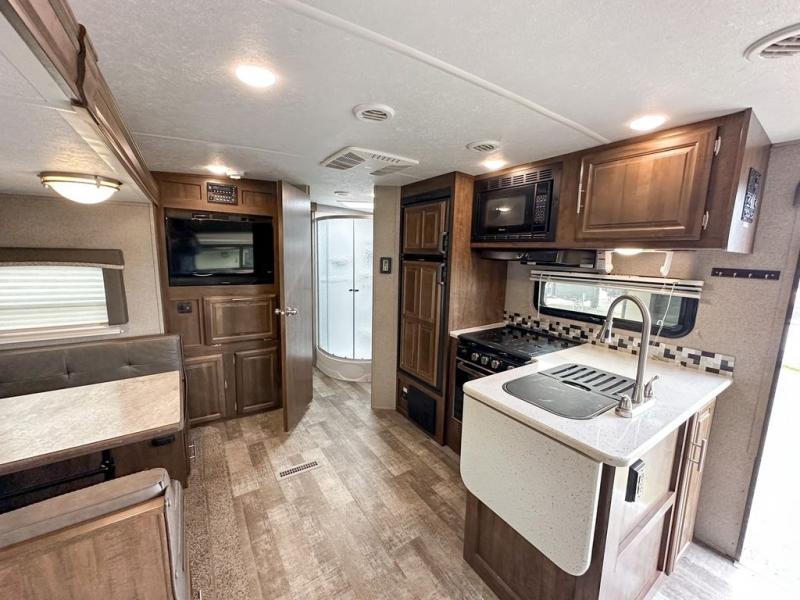 The search is over! This Forest River Rockwood Ultra Lite 2604WS travel trailer offers double entry doors for a smooth flow of traffic in and out of the unit. There are plenty of overhead cabinets throughout the trailer to hold your camping necessities as well as a drop frame pass-through storage to easily access and store your outdoor gear, plus additional exterior storage. While you are whipping up your best meal in the kitchen, you can socialize with the rest of your group as they sit comfortably in either one of the two swivel rockers with tables on either side or on the 67" hide-a-bed sofa. You will also enjoy serving your meal on the countertop extension and enjoying it at the booth dinette. By having the walk-through bath, it allows everyone to have an easy access, especially if you are staying in the front private bedroom.