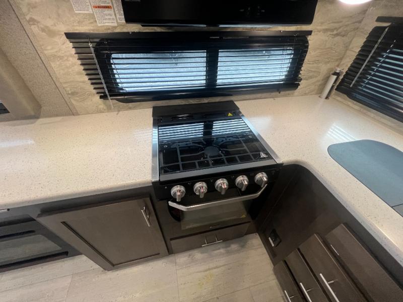 The chef of your group is going to love camping in this rear-kitchen Forest River Rockwood Ultra Lite fifth wheel! There is plenty of counter space for them to create their best meals, and the sliding waste bin makes it easy to dispose of any trash. If they don't feel like cooking indoors, then they can head to the outdoor gas griddle to grill up some juicy burgers. The 44" x 81" king U-shaped dinette is the perfect place for you to enjoy your meals or play some card games while you enjoy the comforts of the fireplace across from it. The front master suite features a queen Serta bed for you to enjoy a good night's rest, and if you need more sleeping spaces for your guests, then you can transform the 60" hide-a-bed sofa and even the dinette!