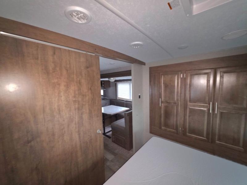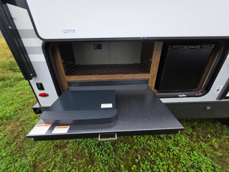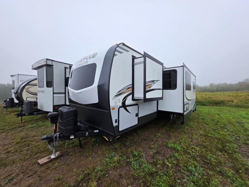 Enjoy any camping trip with this Forest River Rockwood Ultra Lite travel trailer. The kitchen area is where you can easily create meals and snacks while on the go with a pantry big enough to store your favorite goodies! Opposite of the kitchen area, you will find a slide out with a 60" hide-a-bed sofa and a U-shaped dinette. Both of these offer overhead cabinets to keep things tucked away and organized. The double-size bunks are sure to please your kids, and they will also love being right next to the rear bath, especially for those late night trips to the bathroom. There is also an outdoor kitchen so that you can enjoy the outdoors to its fullest, plus a 21' power awning with LED lights to protect you from the sun's rays!
