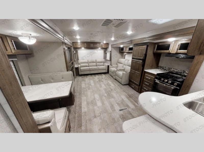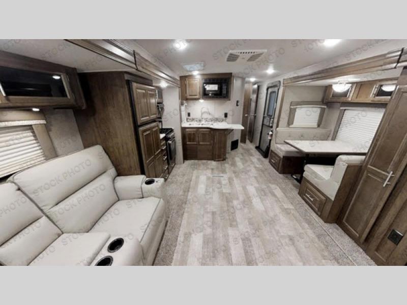 If you have been dreaming of traveling in comfort with everything you need to stay at your favorite campground for a weekend or longer, then this Forest River Rockwood Ultra Lite travel trailer might just fit your dreams and needs perfectly. You will enjoy having your own space in the front master suite with a queen Serta bed that has nightstands on either side, a wardrobe slide, and a private entrance into the dual-entry bath. You will find sleeping space for your kids or grandkids on the booth dinette and the 76" hide-a-bed sofa once prepared for the night. You might even fall asleep in the theater seating if you sit there long enough in front of the fireplace. The chef can wake up the next morning to make breakfast on the outside kitchen or inside with the full amenities including a countertop extension!