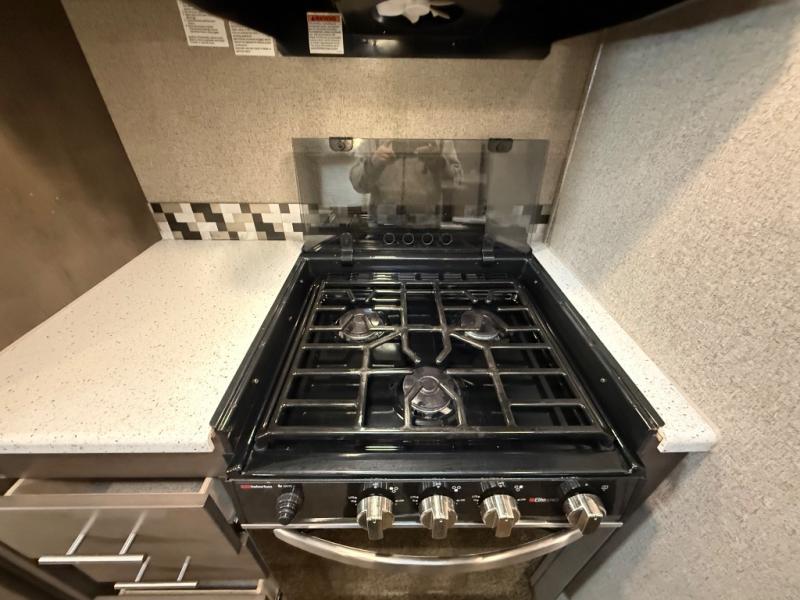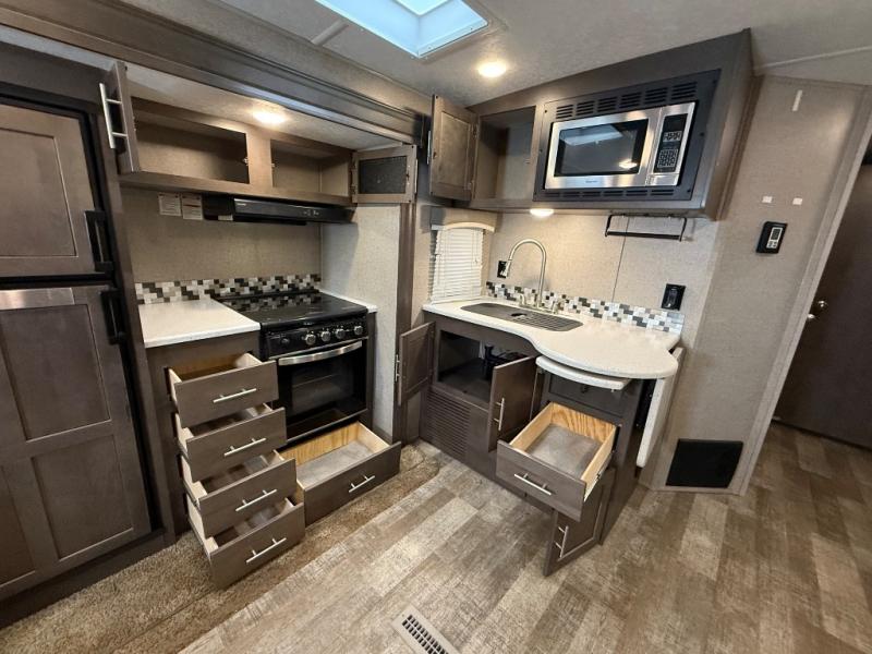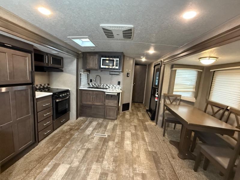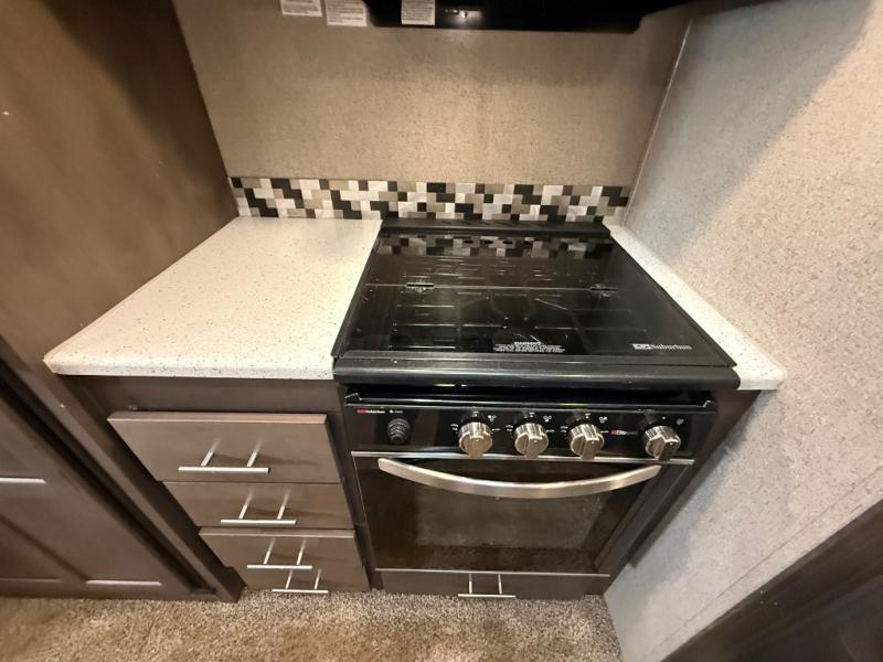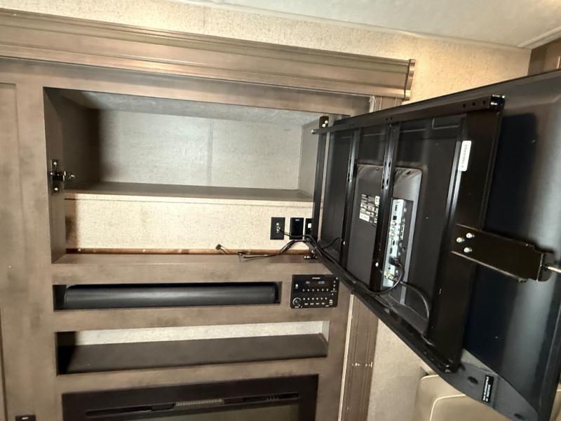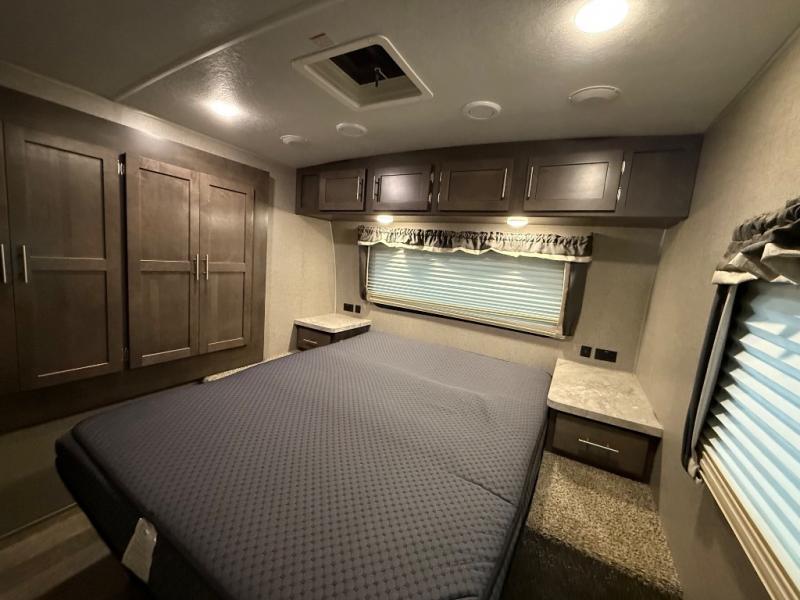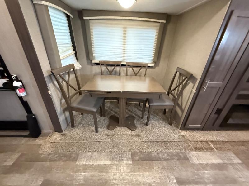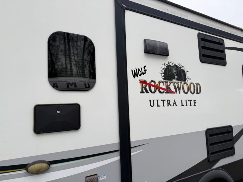 If you have been dreaming of traveling in comfort with everything you need to stay at your favorite campground for a weekend or longer, then this Forest River Rockwood Ultra Lite travel trailer might just fit your dreams and needs perfectly. You will enjoy having your own space in the front master suite with a queen Serta bed that has nightstands on either side, a wardrobe slide, and a private entrance into the dual-entry bath. You will find sleeping space for your kids or grandkids on the booth dinette and the 76" hide-a-bed sofa once prepared for the night. You might even fall asleep in the theater seating if you sit there long enough in front of the fireplace. The chef can wake up the next morning to make breakfast on the outside kitchen or inside with the full amenities including a countertop extension!