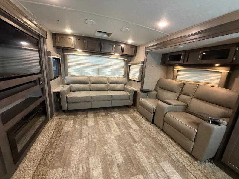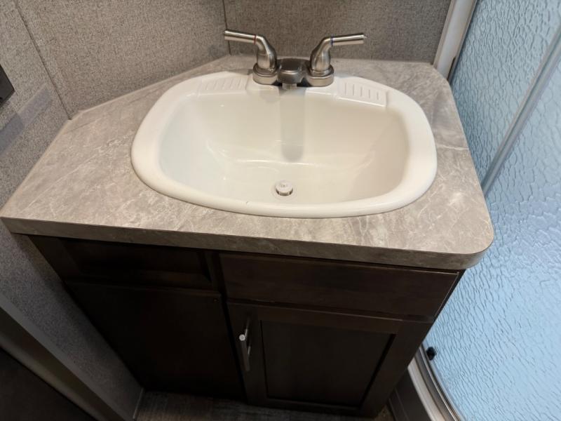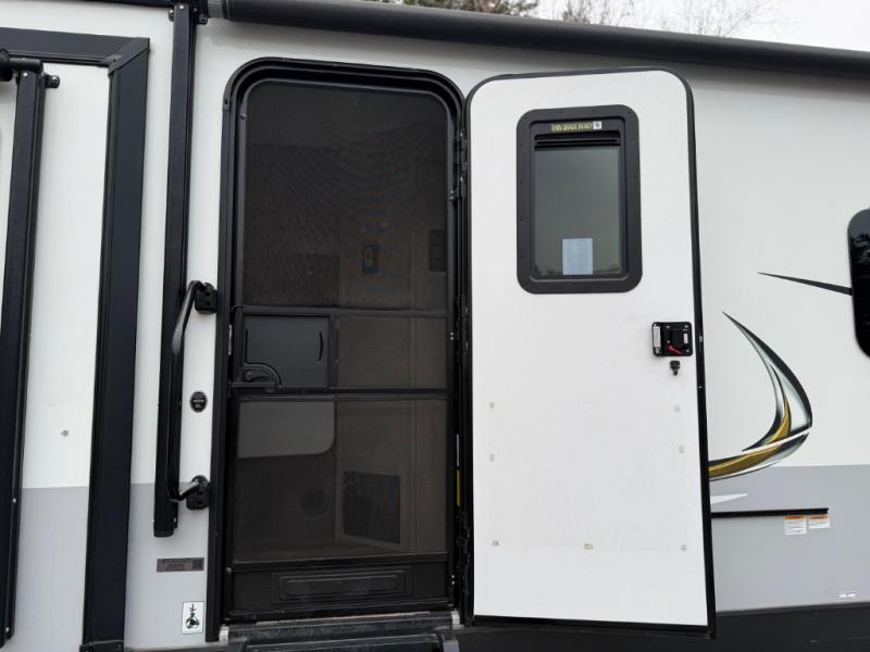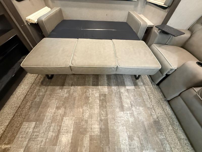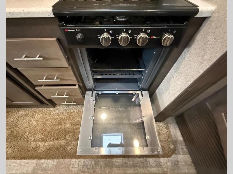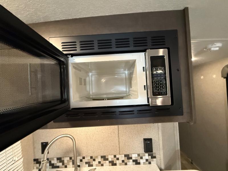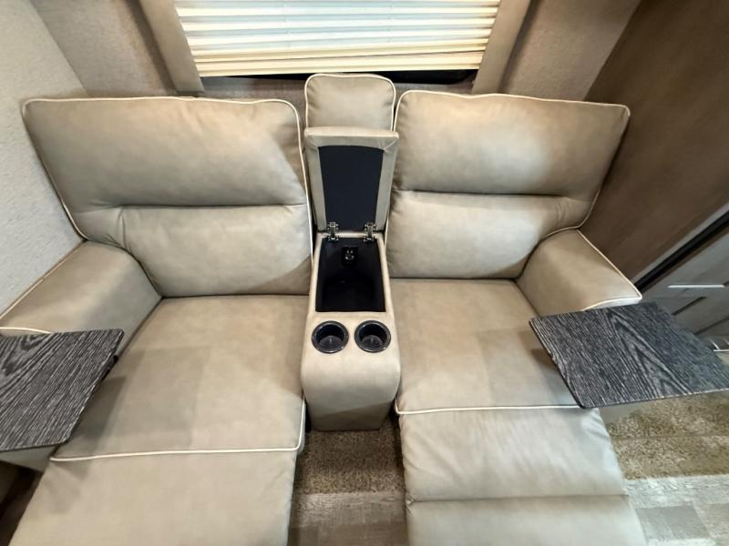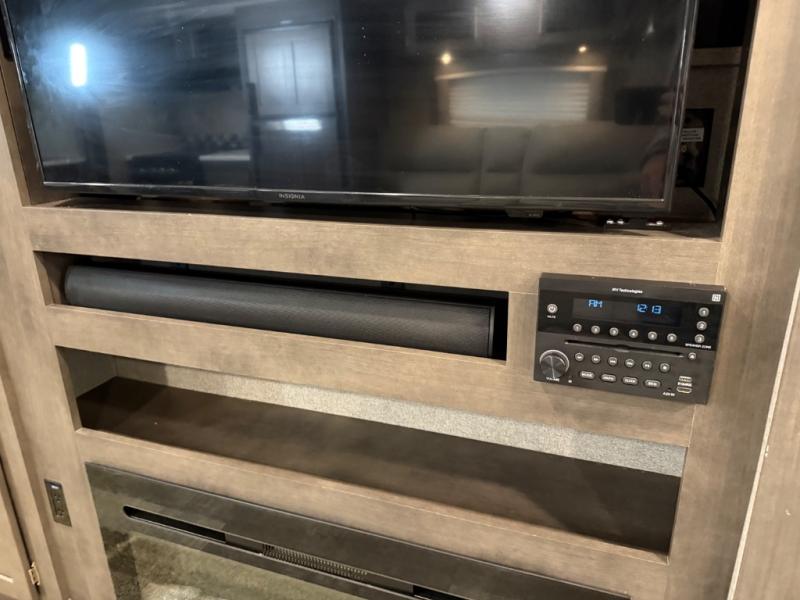 If you have been dreaming of traveling in comfort with everything you need to stay at your favorite campground for a weekend or longer, then this Forest River Rockwood Ultra Lite travel trailer might just fit your dreams and needs perfectly. You will enjoy having your own space in the front master suite with a queen Serta bed that has nightstands on either side, a wardrobe slide, and a private entrance into the dual-entry bath. You will find sleeping space for your kids or grandkids on the booth dinette and the 76" hide-a-bed sofa once prepared for the night. You might even fall asleep in the theater seating if you sit there long enough in front of the fireplace. The chef can wake up the next morning to make breakfast on the outside kitchen or inside with the full amenities including a countertop extension!