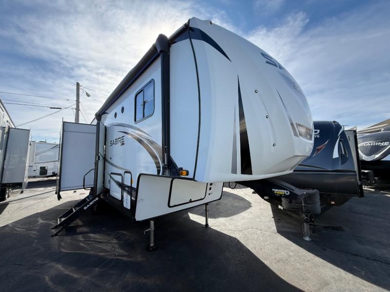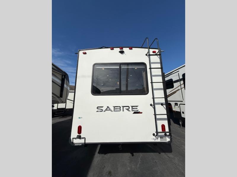 You will experience a luxurious camping trip at an affordable price with any one of these Forest River Sabre fifth wheels! These fifth wheels are durable and ready to travel anytime of the year thanks to features like the high-gloss gel-coat front cap, the maintenance-free heavy-duty PVC roof membrane, and the forced air, heated and enclosed gate valves and underbelly. The Generation III electric auto-leveling system makes setting up easy and safe. With the Sabre Cobalt package, you will enjoy exterior features like the universal docking station which includes a black tank flush and an outside shower and the MOR/Ryde quad "Step Above" entry steps for you to enter and exit the unit safely. The interior All-Inclusive package gives you plenty of entertainment and luxurious features to make you feel right at home, like the Cinemax seating, the fireplace with remote, and the double high-output USB charging ports so that you can stay connected the entire time.