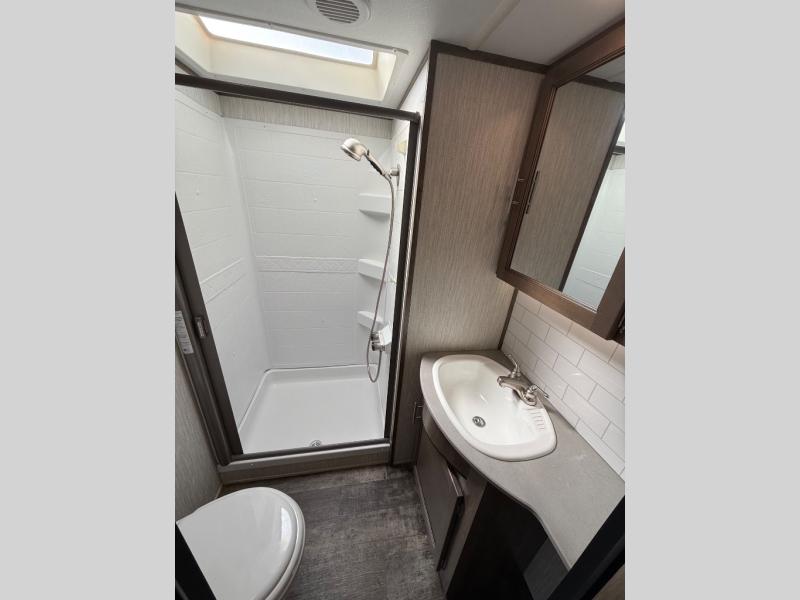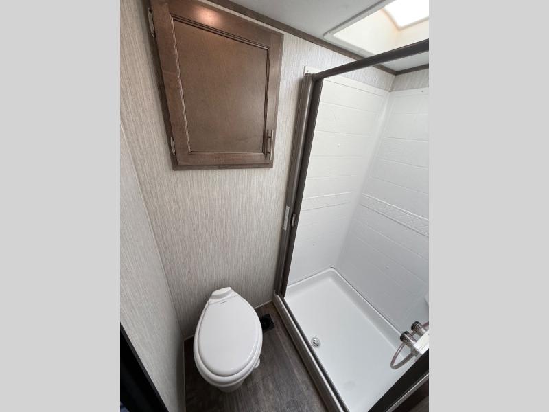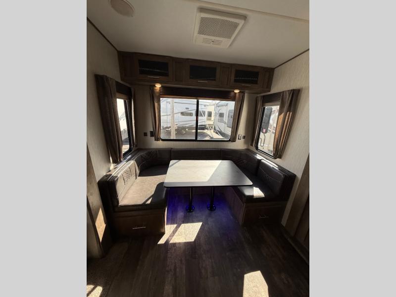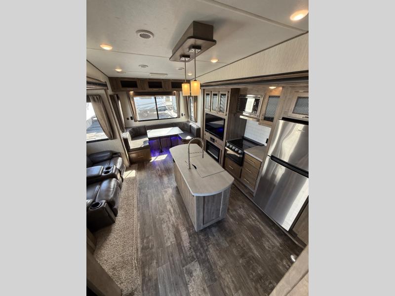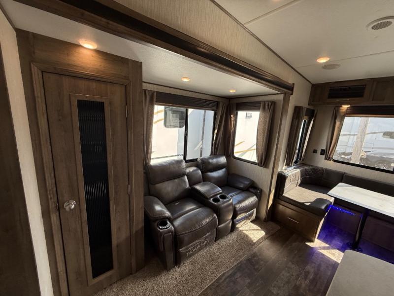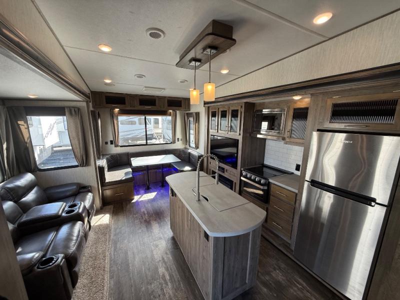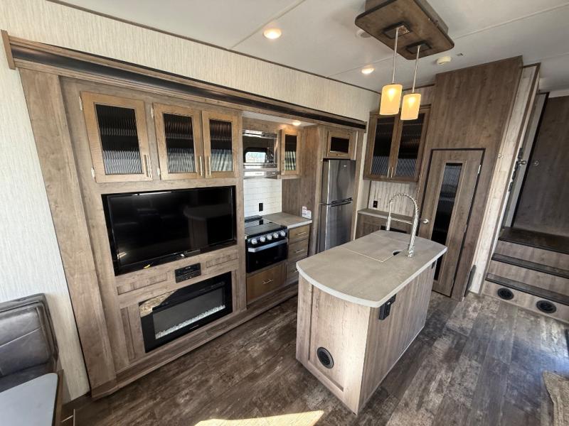 After quickly setting up at your campsite, you can relax underneath the 13' power adjustable awning before heading inside this Sabre Light-Weight fifth wheel or meeting friends at the lake. If you need to grab a few snacks, you will have two pantries to check and a 10 cubic foot refrigerator to grab a cold drink or two. Once you are ready to make dinner, you can prepare the food on the center island that has a residential farm sink to wash the veggies, and if you travel during the cooler months, you will certainly appreciate having a fireplace next to the U-shaped dinette. The dinette is quite spacious, and the views out the windows will have you never wanting to go home.