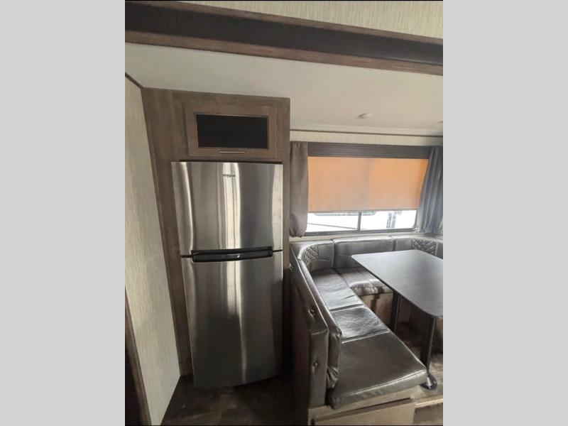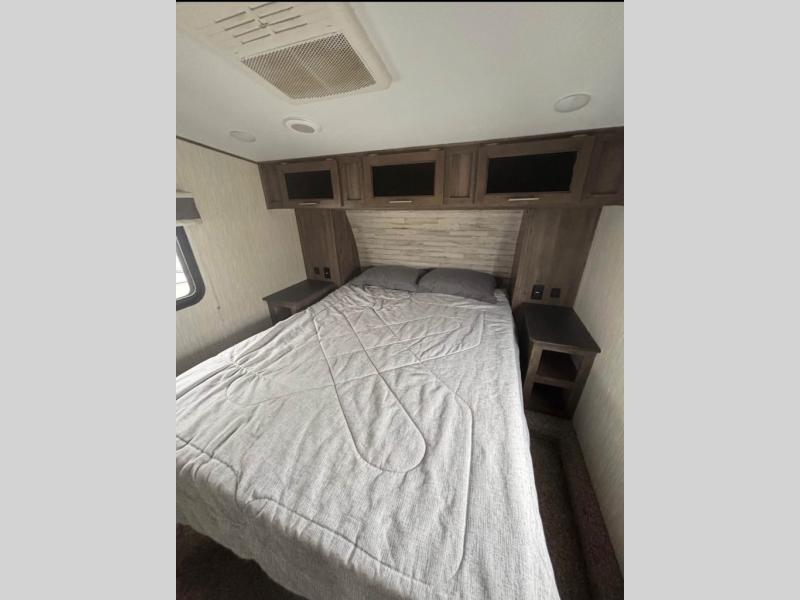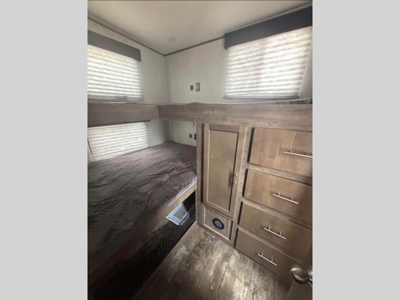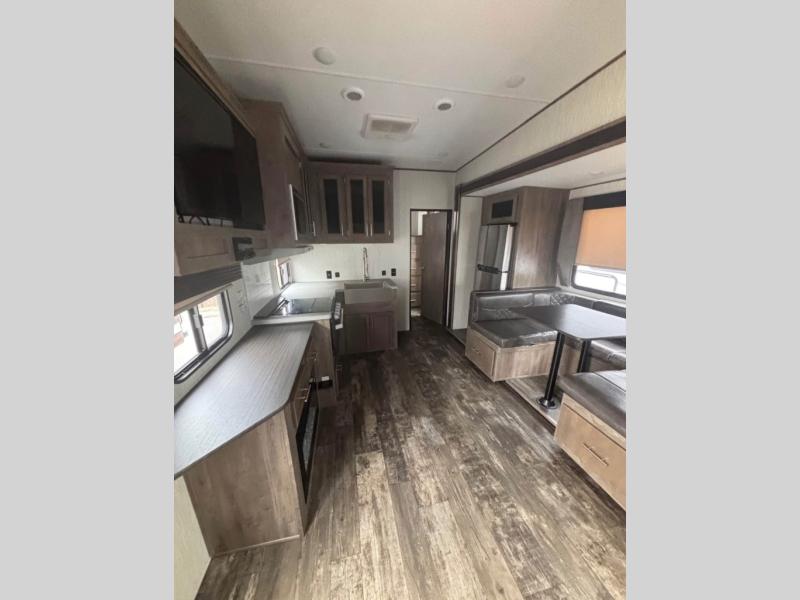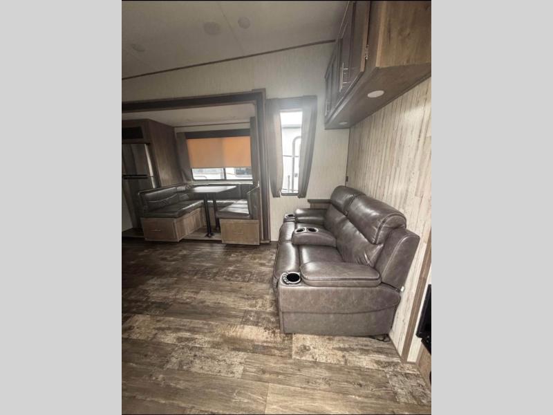Scenic views, a full kitchen, complete bathroom amenities, triple bunk beds to sleep four tired campers, and a master bedroom to retreat to after a fun day outdoors sound like a good time! With this Sabre Light-Weight fifth wheel, the hardest decisions you will have to make is if you want to cook inside or outside, to relax on the Cinemax theatre seating with heat and massage or sit outdoors under the power adjustable awning, and what your next adventure will be. This fifth wheel even has plenty of storage with the bunkhouse drawers, the bedroom shirt closets and wardrobe, the overhead cabinets, and the exterior open pass-through storage that can hold those larger camping items.