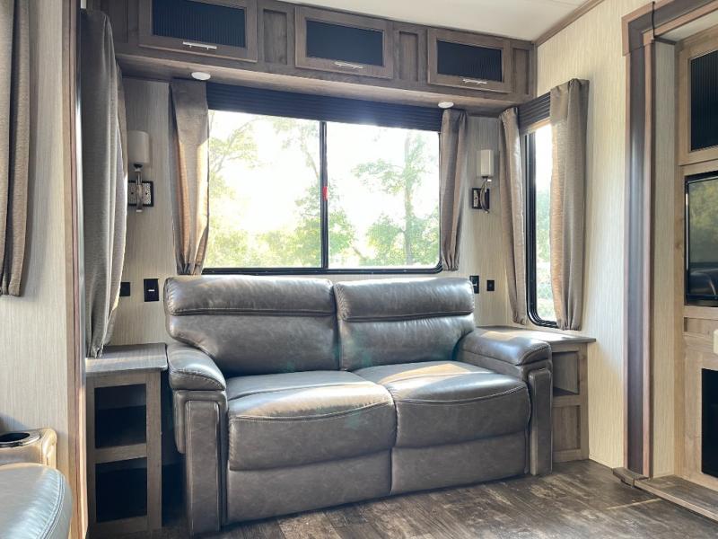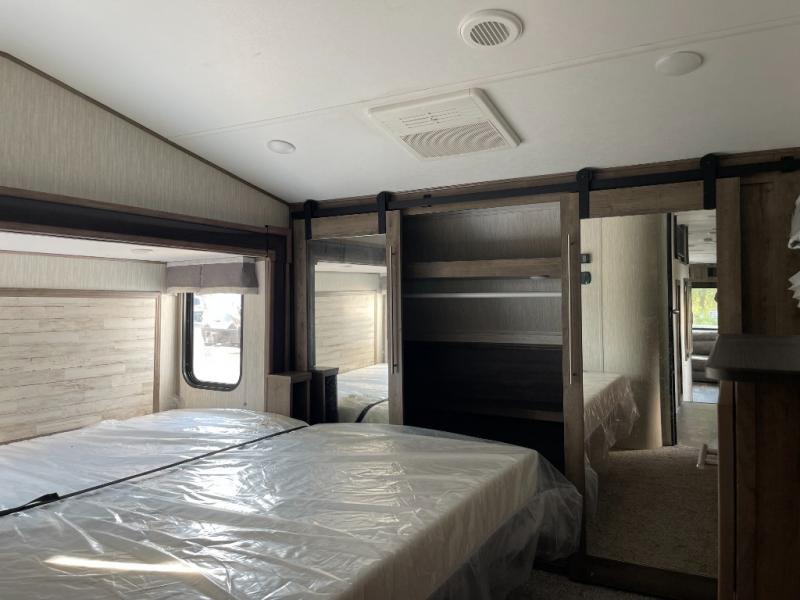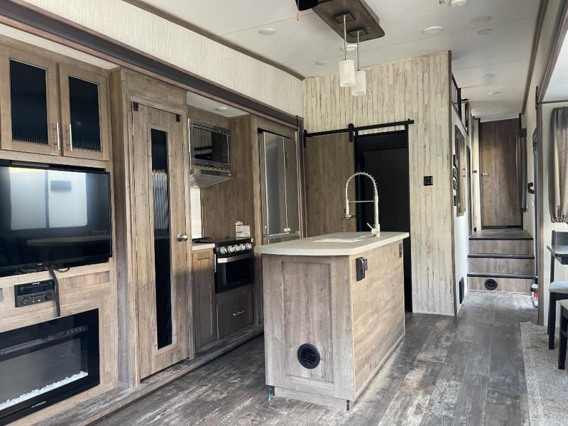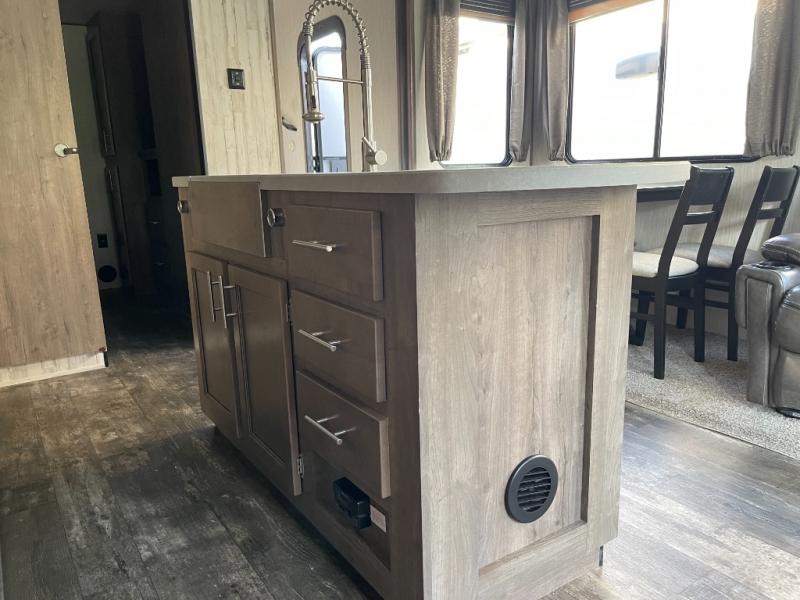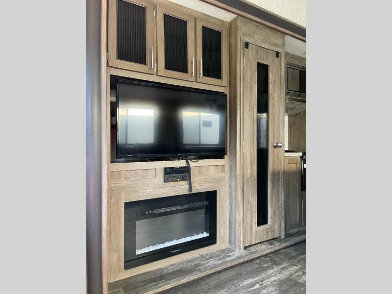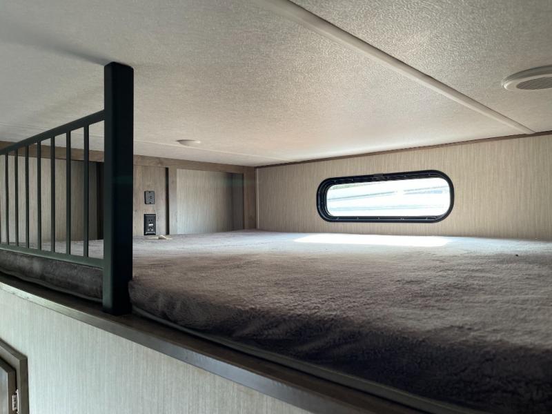 There's something for everyone in this Sabre fifth wheel! From the front private bedroom with a queen bed that can be replaced for an optional king bed and a front closet with an area prepped for the optional washer and dryer, to the second bedroom featuring a jackknife sofa, a trundle bed, a bunk bed, and a loft area above it all, this unit is super accommodating. The kitchen island not only provides extra counter and storage space, but is also makes cleaning up even easier with the farm-style sink and deluxe pull-down faucet. After you have spent a fun day in the sun, head to the rear living area and relax on either the tri-fold sofa which can be transformed into an extra sleeping space or on the home theatre seating with heat and massage. As you sit back and relax, you'll find a fireplace directly across with a large residential TV above it for you to watch your favorite movie!