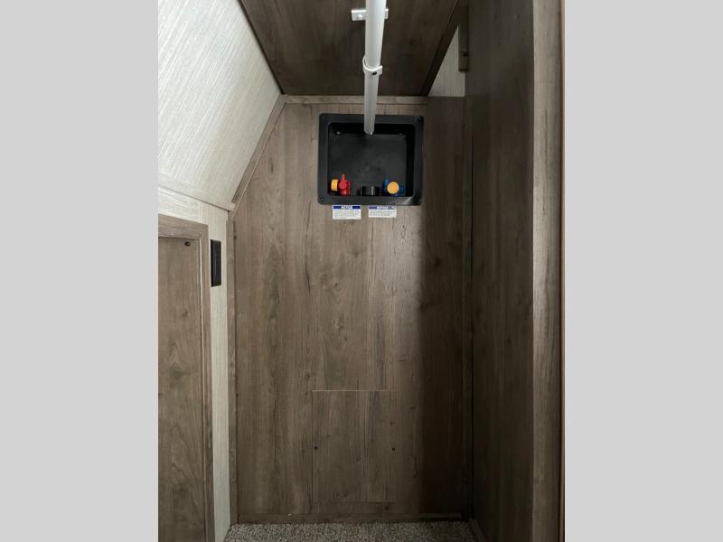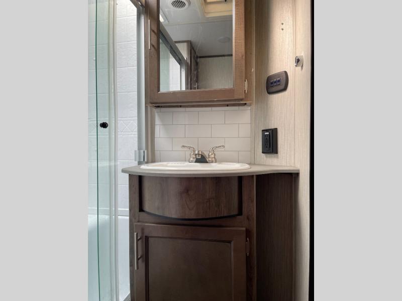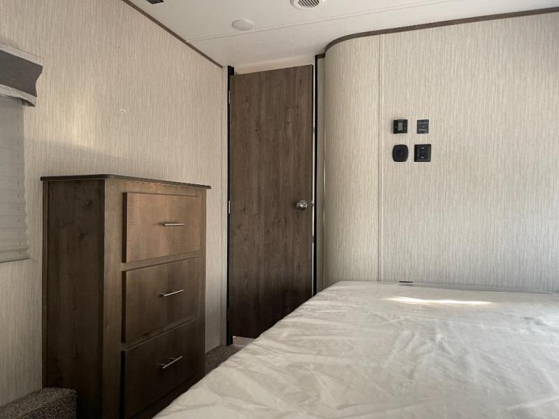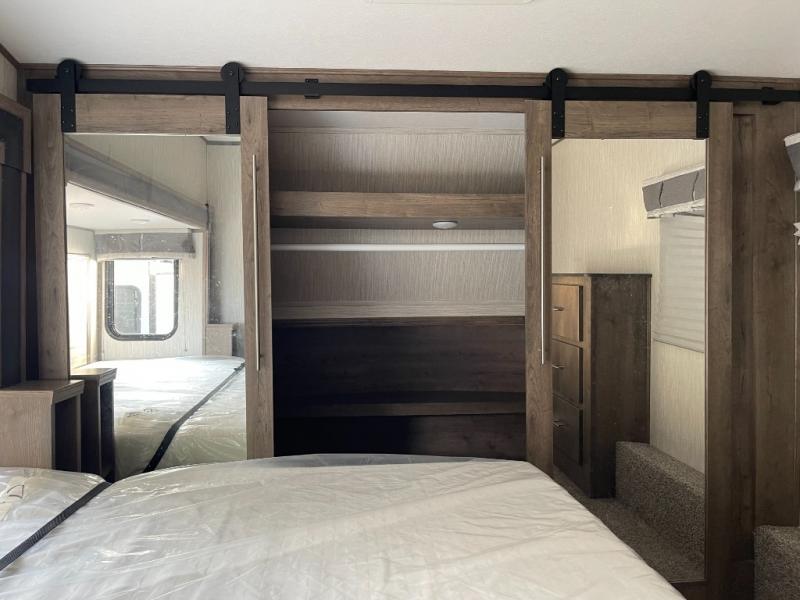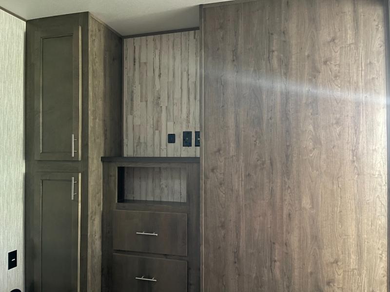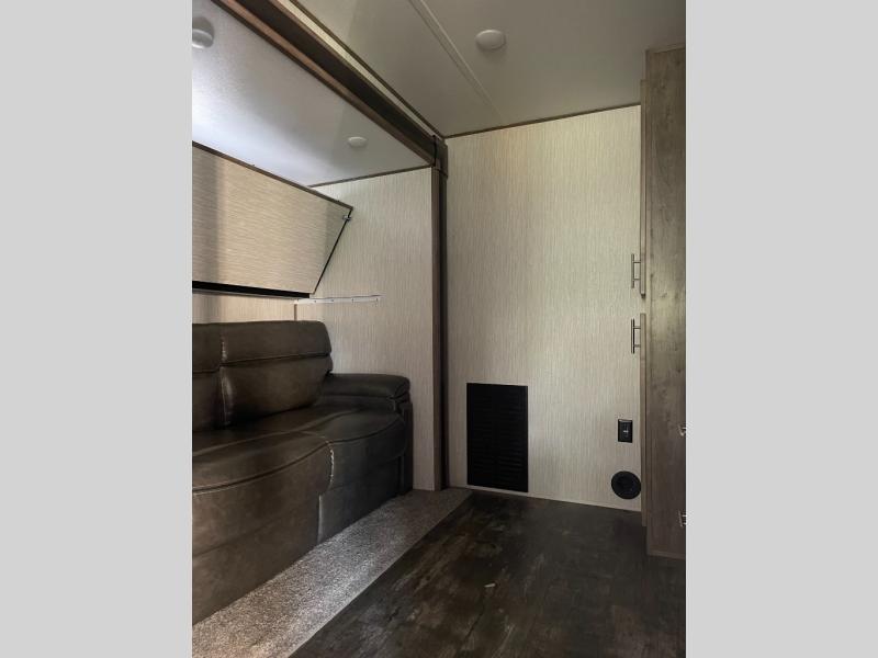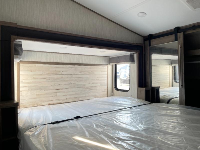 There's something for everyone in this Sabre fifth wheel! From the front private bedroom with a queen bed that can be replaced for an optional king bed and a front closet with an area prepped for the optional washer and dryer, to the second bedroom featuring a jackknife sofa, a trundle bed, a bunk bed, and a loft area above it all, this unit is super accommodating. The kitchen island not only provides extra counter and storage space, but is also makes cleaning up even easier with the farm-style sink and deluxe pull-down faucet. After you have spent a fun day in the sun, head to the rear living area and relax on either the tri-fold sofa which can be transformed into an extra sleeping space or on the home theatre seating with heat and massage. As you sit back and relax, you'll find a fireplace directly across with a large residential TV above it for you to watch your favorite movie!