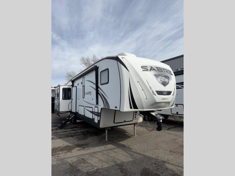 You will experience a luxurious camping trip at an affordable price with any one of these Forest River Sabre fifth wheels! These fifth wheels are durable and ready to travel anytime of the year thanks to features like the high-gloss gel-coat front cap, the maintenance-free heavy-duty PVC roof membrane, and the forced air, heated and enclosed gate valves and underbelly. The Generation III electric auto-leveling system makes setting up easy and safe. With the Sabre Cobalt package, you will enjoy exterior features like the universal docking station which includes a black tank flush and an outside shower and the MOR/Ryde quad "Step Above" entry steps for you to enter and exit the unit safely. The interior All-Inclusive package gives you plenty of entertainment and luxurious features to make you feel right at home, like the Cinemax seating, the fireplace with remote, and the double high-output USB charging ports so that you can stay connected the entire time.