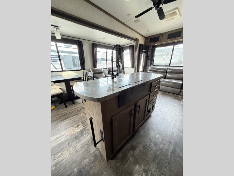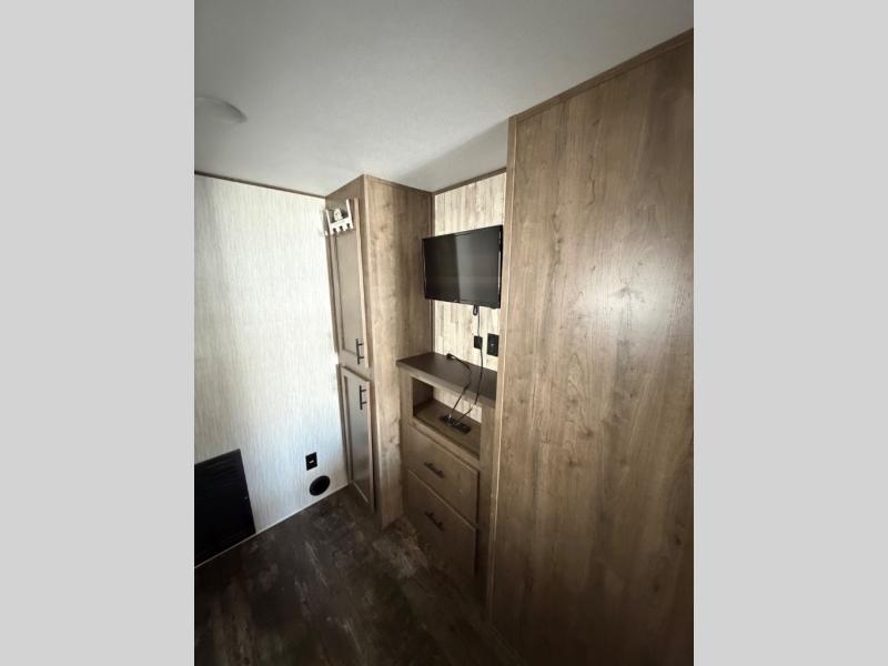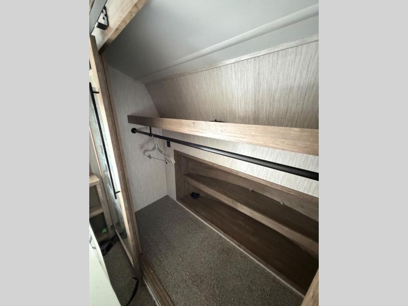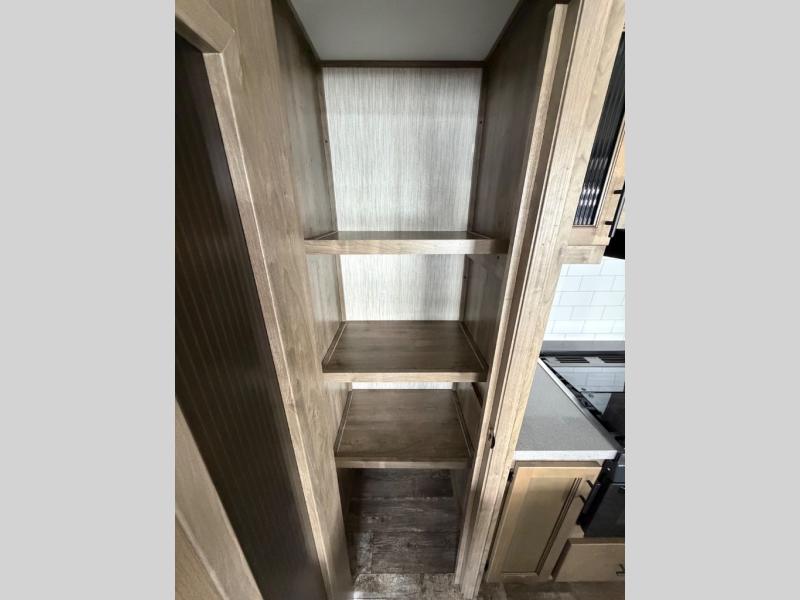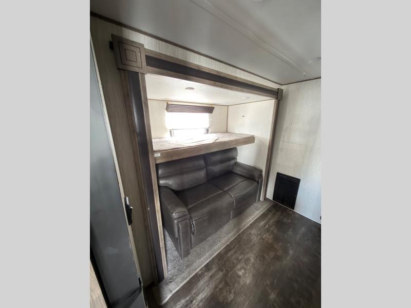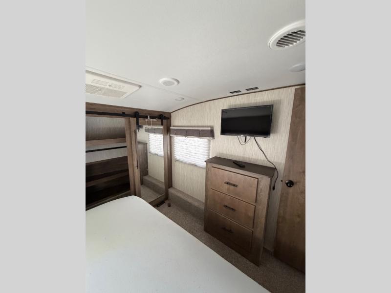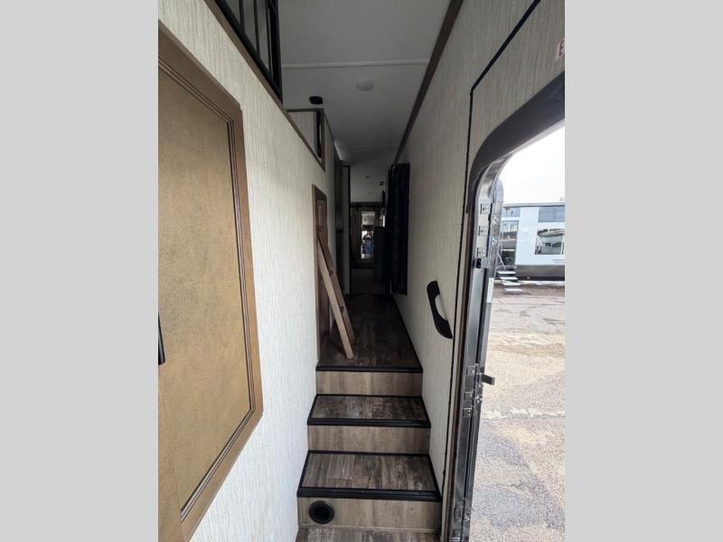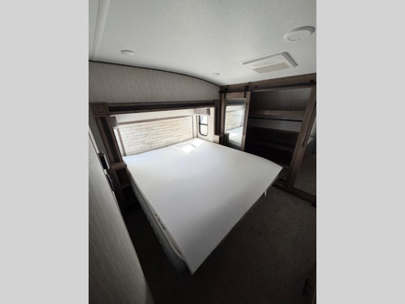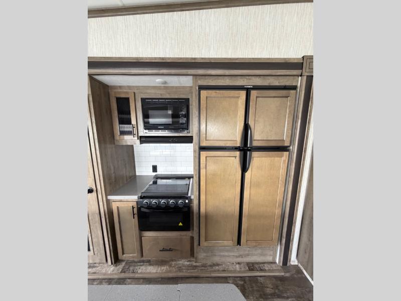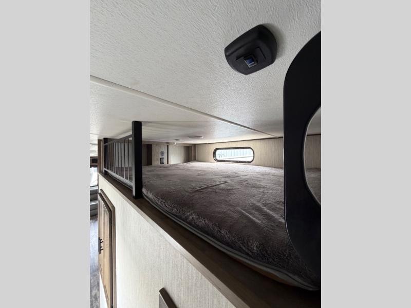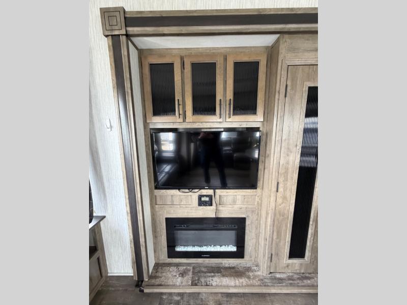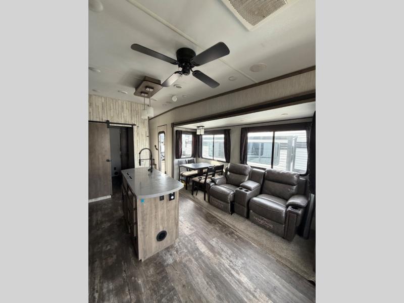 There's something for everyone in this Sabre fifth wheel! From the front private bedroom with a queen bed that can be replaced for an optional king bed and a front closet with an area prepped for the optional washer and dryer, to the second bedroom featuring a jackknife sofa, a trundle bed, a bunk bed, and a loft area above it all, this unit is super accommodating. The kitchen island not only provides extra counter and storage space, but is also makes cleaning up even easier with the farm-style sink and deluxe pull-down faucet. After you have spent a fun day in the sun, head to the rear living area and relax on either the tri-fold sofa which can be transformed into an extra sleeping space or on the home theatre seating with heat and massage. As you sit back and relax, you'll find a fireplace directly across with a large residential TV above it for you to watch your favorite movie!