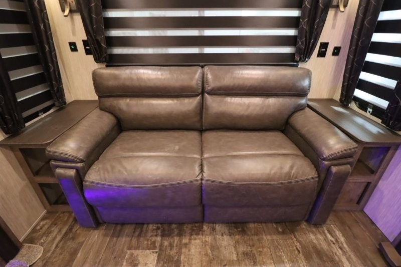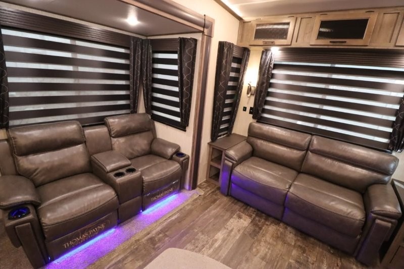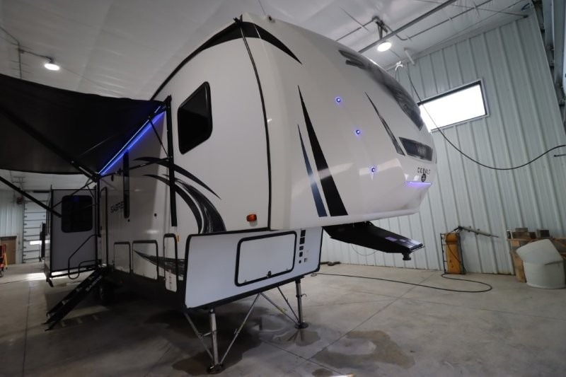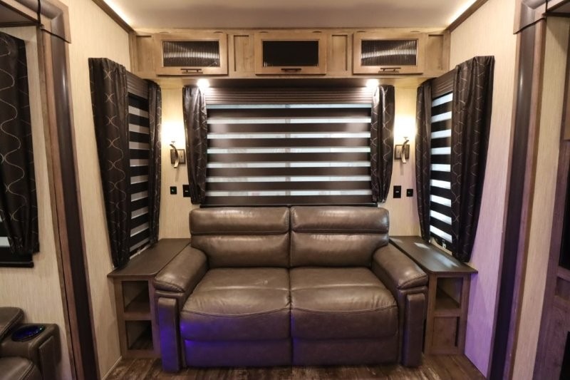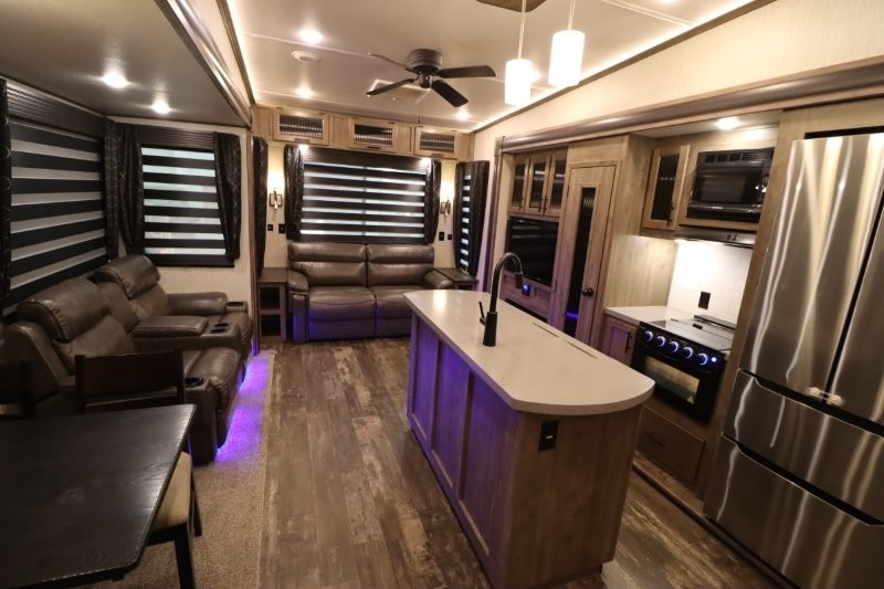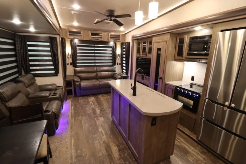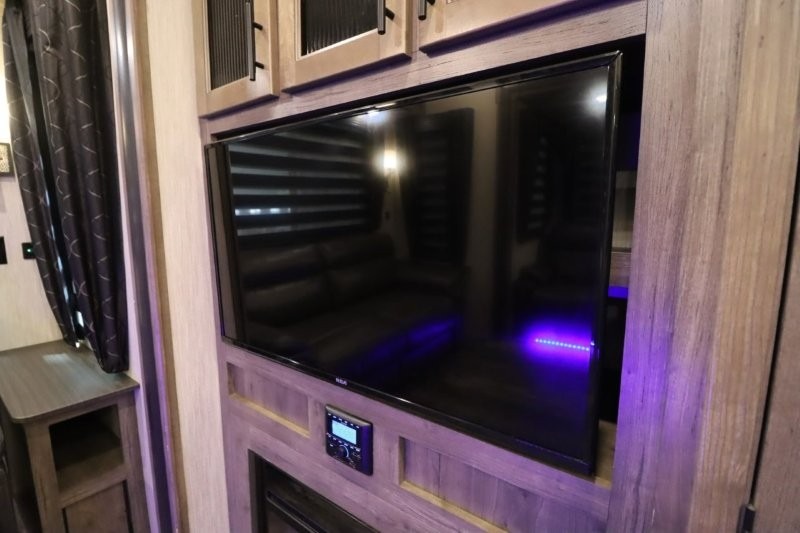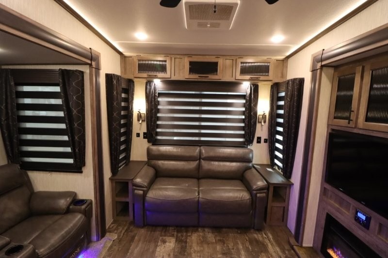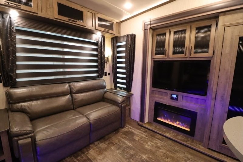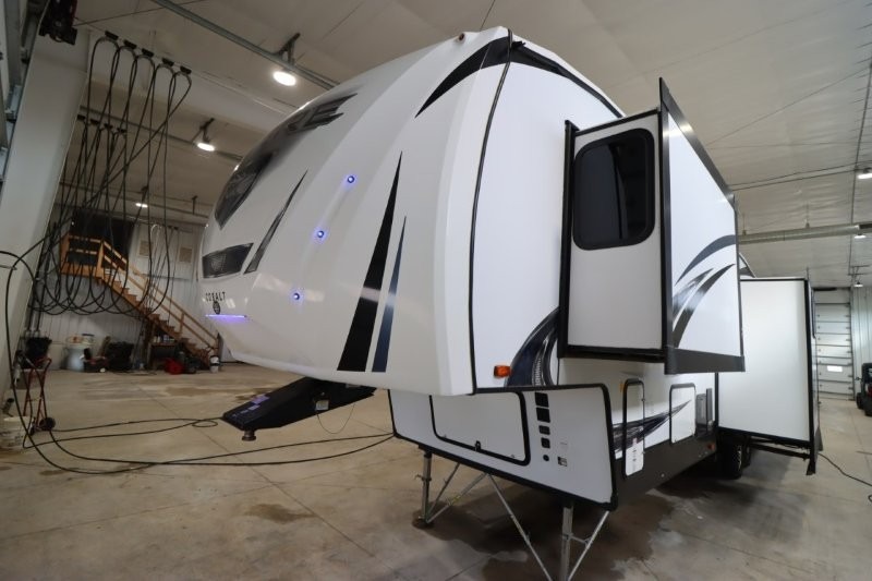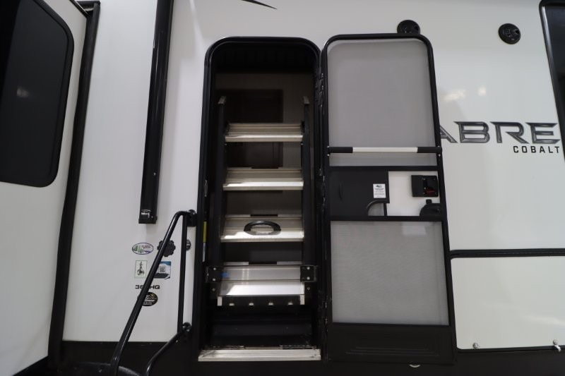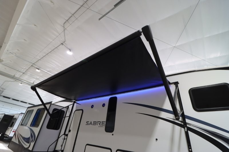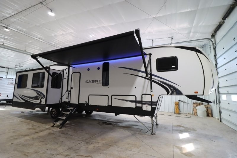 You will experience a luxurious camping trip at an affordable price with any one of these Forest River Sabre fifth wheels! These fifth wheels are durable and ready to travel anytime of the year thanks to features like the high-gloss gel-coat front cap, the maintenance-free heavy-duty PVC roof membrane, and the forced air, heated and enclosed gate valves and underbelly. The Generation III electric auto-leveling system makes setting up easy and safe. With the Sabre Cobalt package, you will enjoy exterior features like the universal docking station which includes a black tank flush and an outside shower and the MOR/Ryde quad "Step Above" entry steps for you to enter and exit the unit safely. The interior All-Inclusive package gives you plenty of entertainment and luxurious features to make you feel right at home, like the Cinemax seating, the fireplace with remote, and the double high-output USB charging ports so that you can stay connected the entire time.