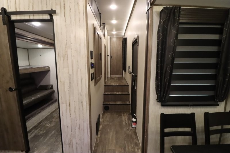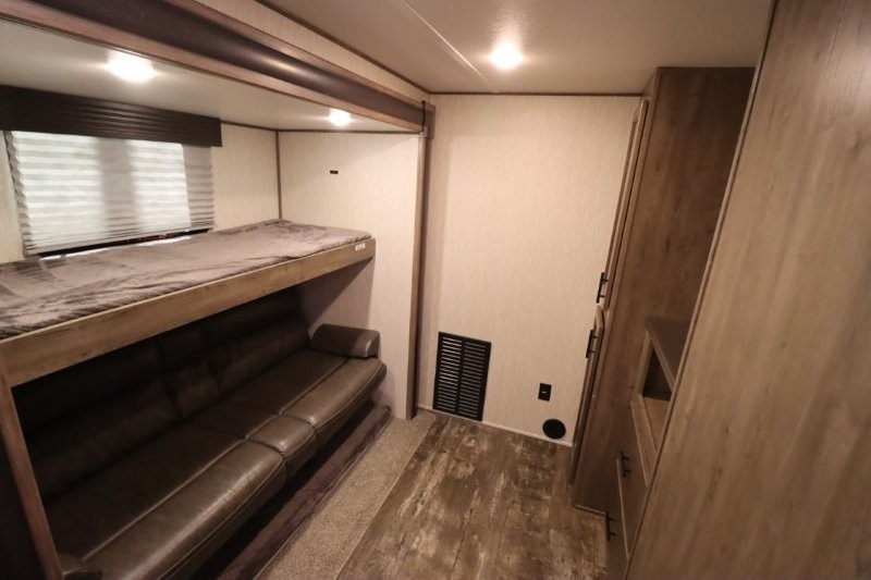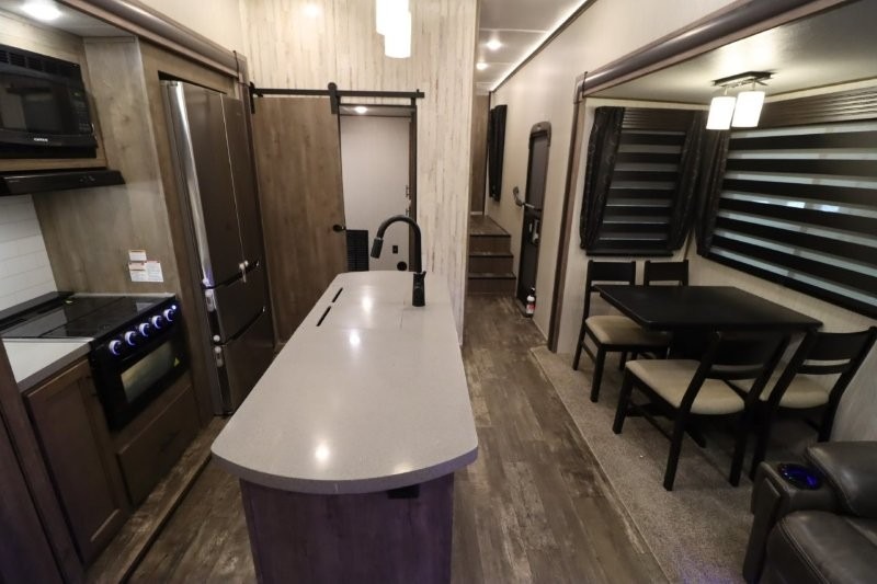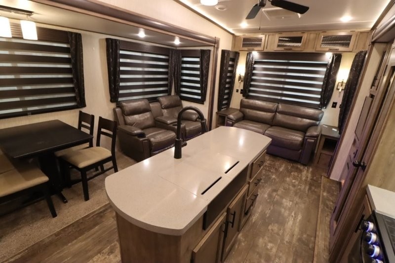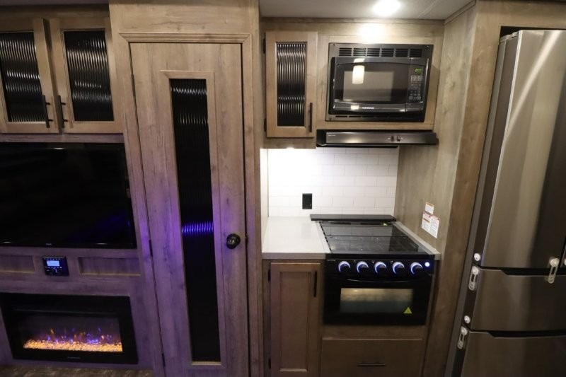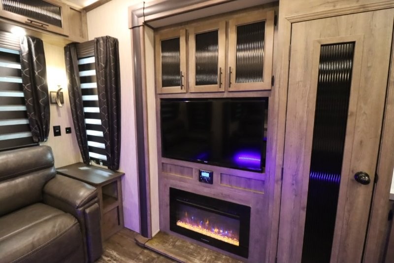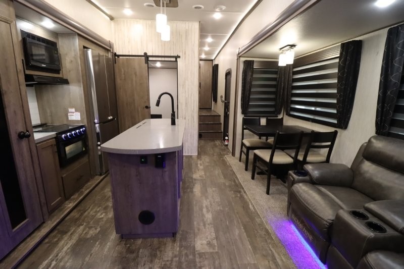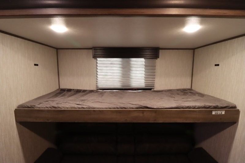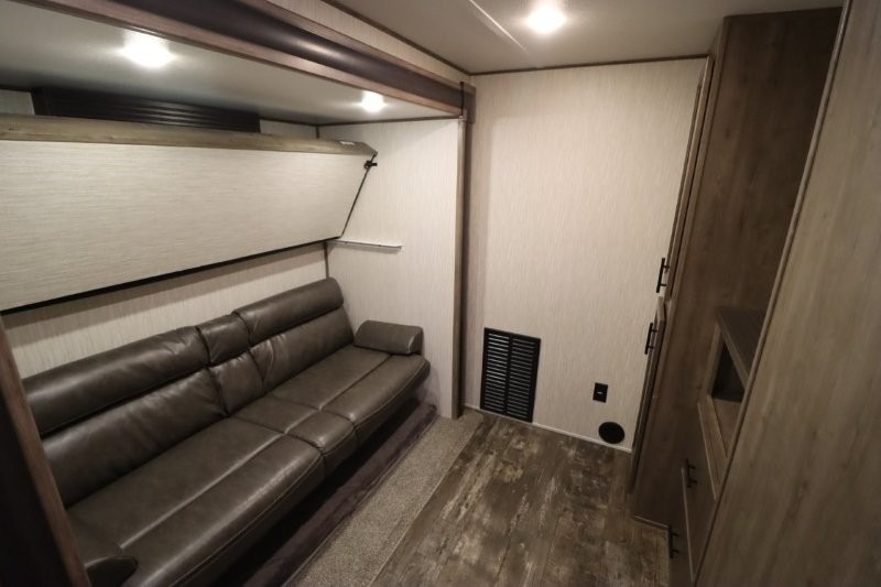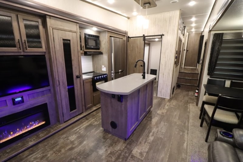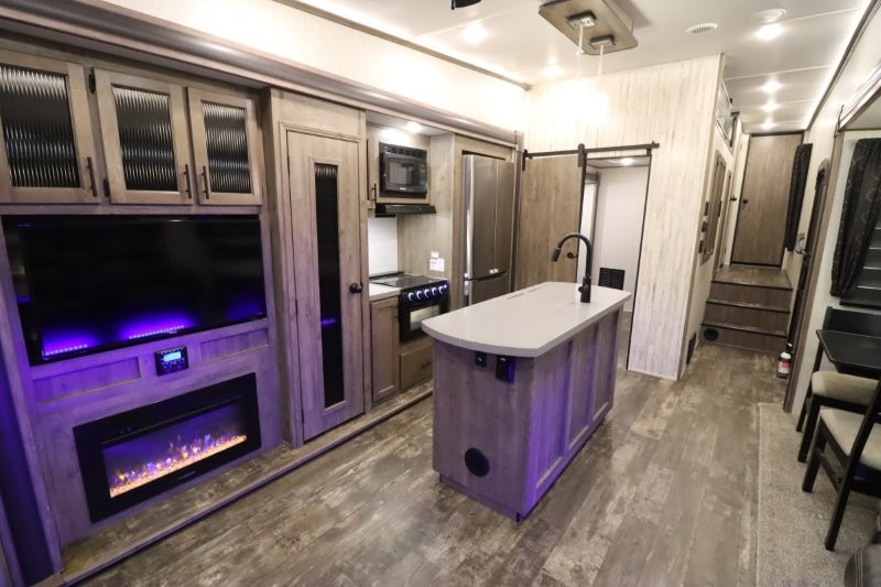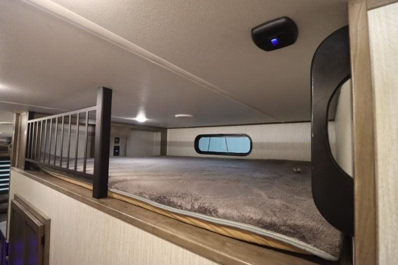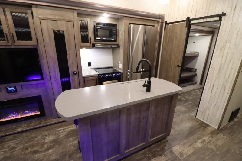 There's something for everyone in this Sabre fifth wheel! From the front private bedroom with a queen bed that can be replaced for an optional king bed and a front closet with an area prepped for the optional washer and dryer, to the second bedroom featuring a jackknife sofa, a trundle bed, a bunk bed, and a loft area above it all, this unit is super accommodating. The kitchen island not only provides extra counter and storage space, but is also makes cleaning up even easier with the farm-style sink and deluxe pull-down faucet. After you have spent a fun day in the sun, head to the rear living area and relax on either the tri-fold sofa which can be transformed into an extra sleeping space or on the home theatre seating with heat and massage. As you sit back and relax, you'll find a fireplace directly across with a large residential TV above it for you to watch your favorite movie!