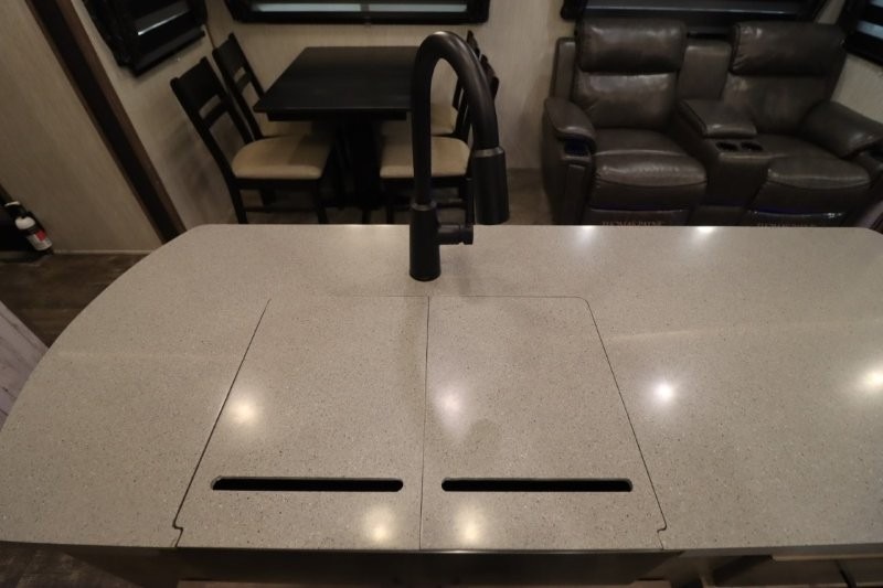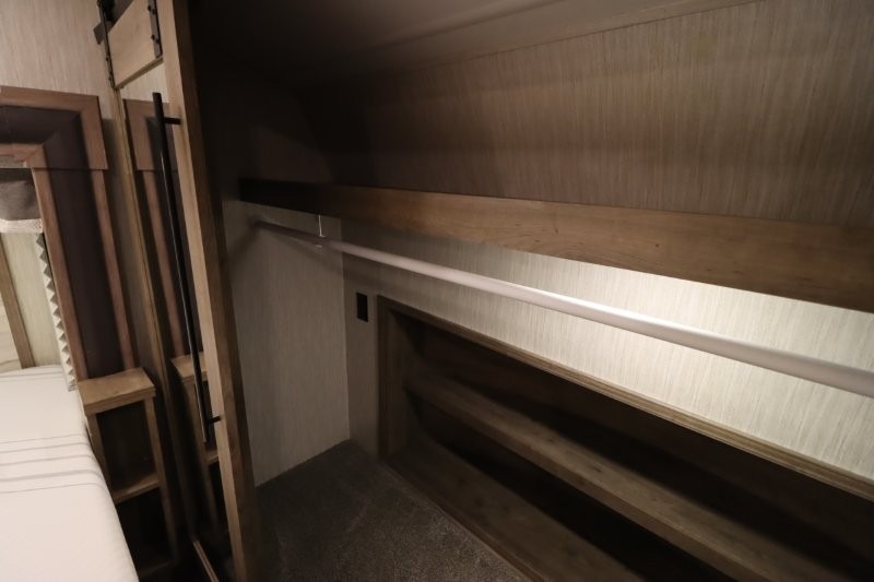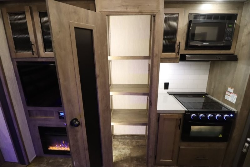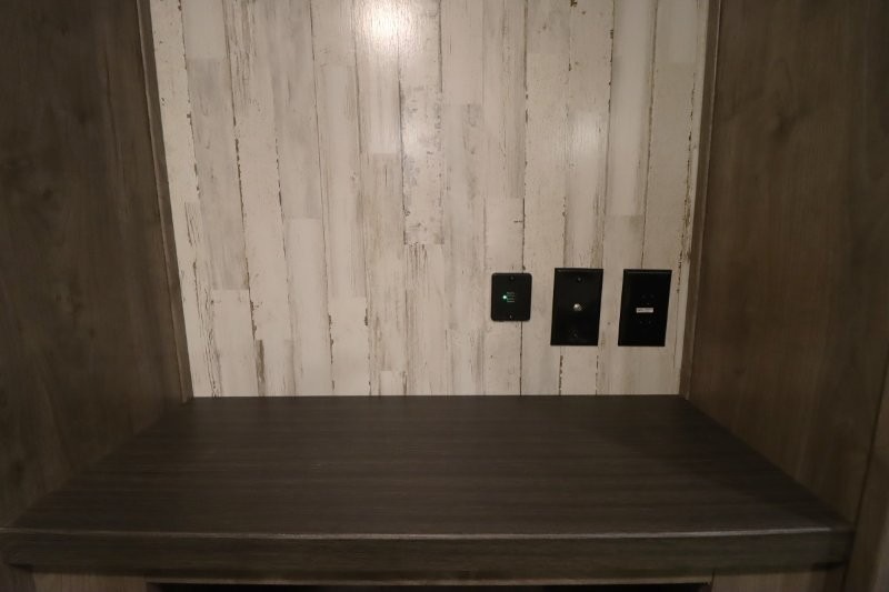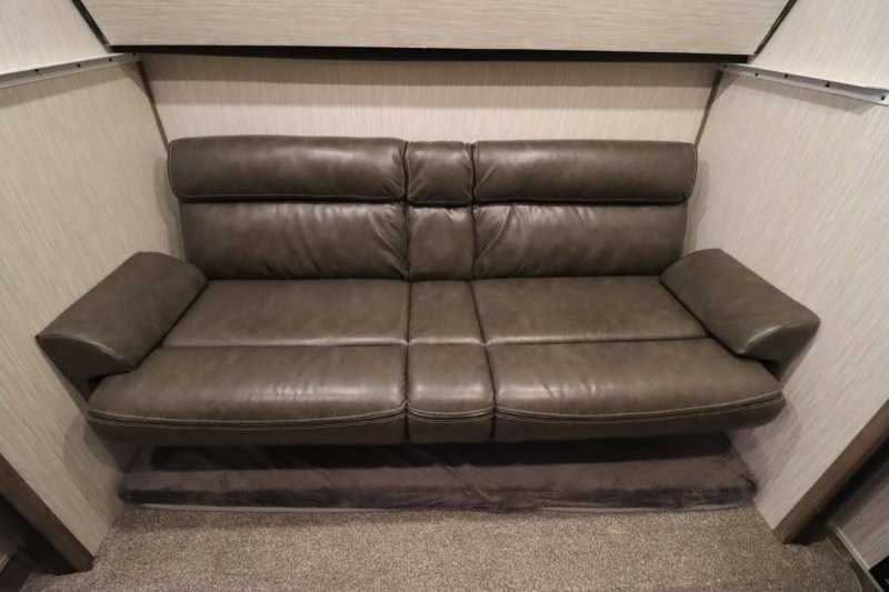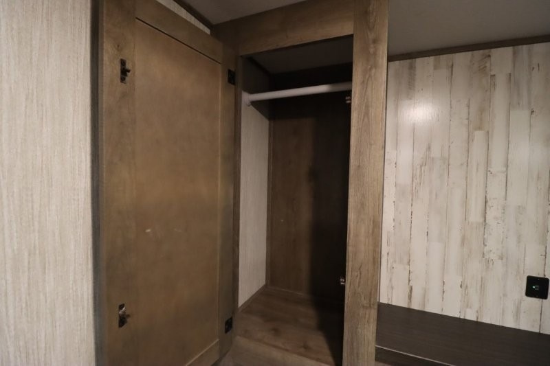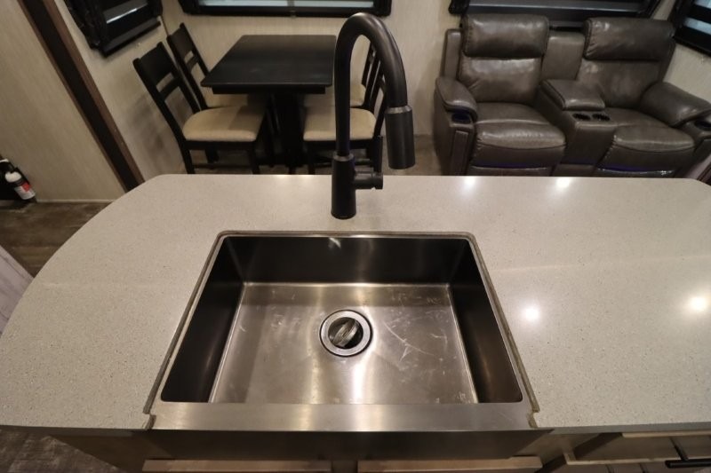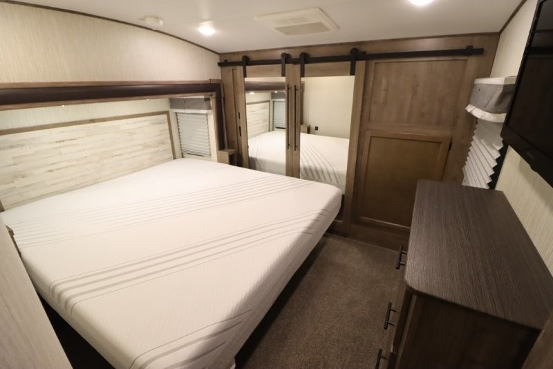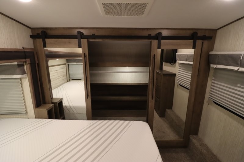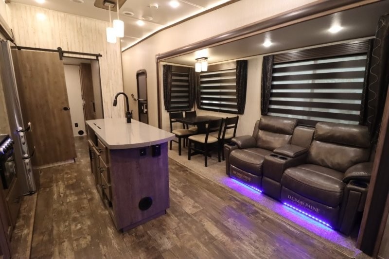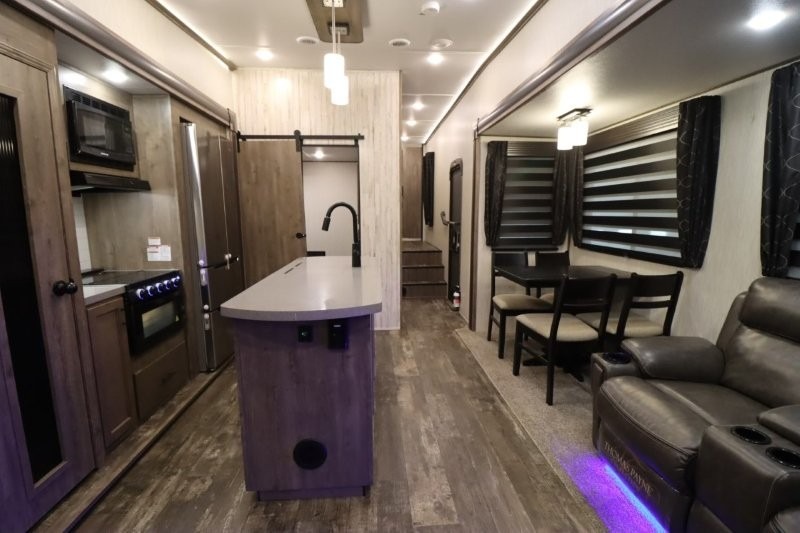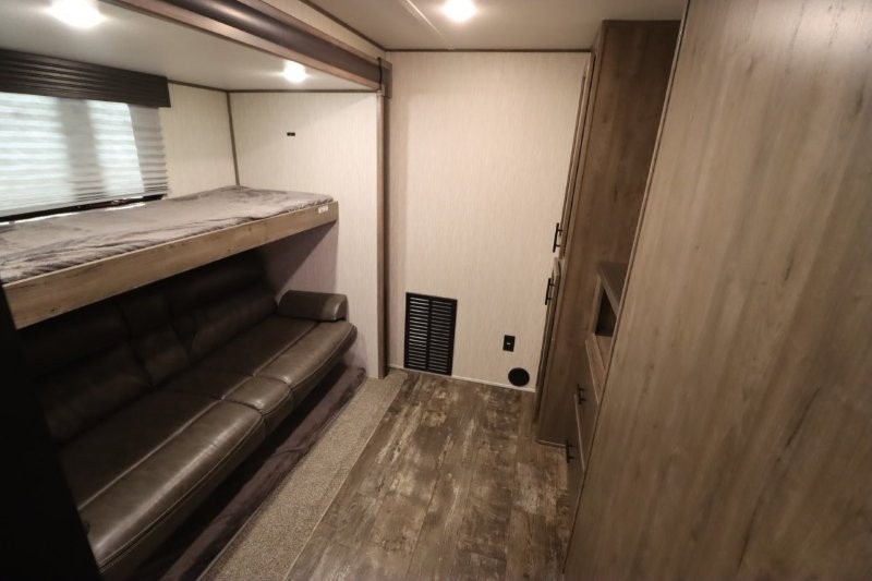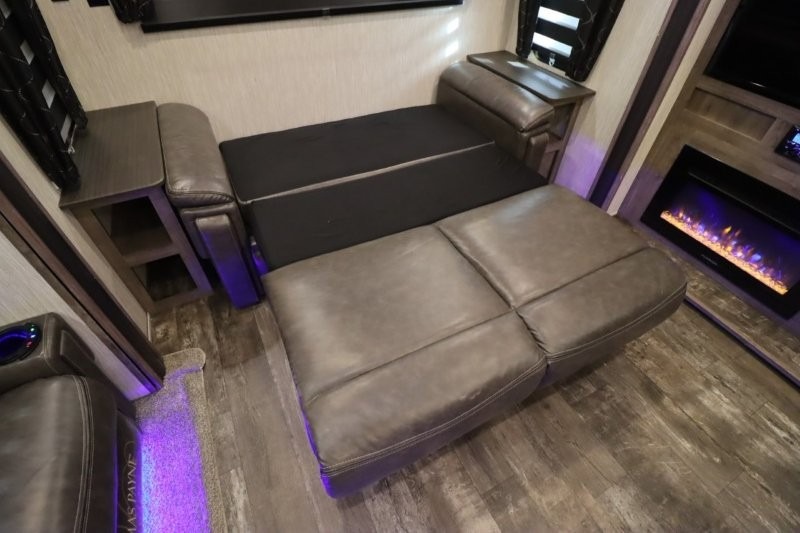 There's something for everyone in this Sabre fifth wheel! From the front private bedroom with a queen bed that can be replaced for an optional king bed and a front closet with an area prepped for the optional washer and dryer, to the second bedroom featuring a jackknife sofa, a trundle bed, a bunk bed, and a loft area above it all, this unit is super accommodating. The kitchen island not only provides extra counter and storage space, but is also makes cleaning up even easier with the farm-style sink and deluxe pull-down faucet. After you have spent a fun day in the sun, head to the rear living area and relax on either the tri-fold sofa which can be transformed into an extra sleeping space or on the home theatre seating with heat and massage. As you sit back and relax, you'll find a fireplace directly across with a large residential TV above it for you to watch your favorite movie!