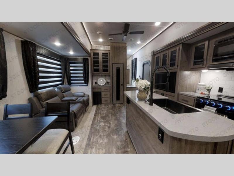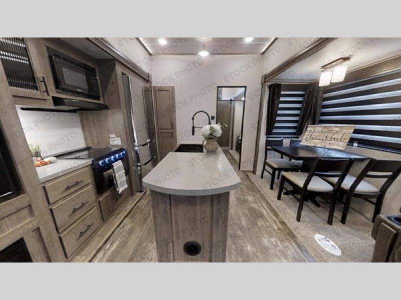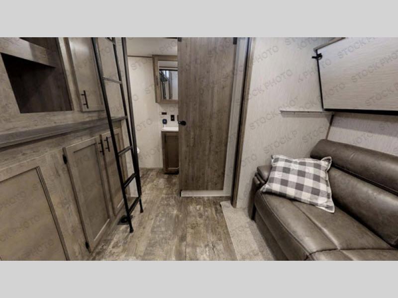 With two full bathrooms in this Sabre fifth wheel, everyone can stay squeaky clean, and with the front private bedroom featuring an area for you to add the optional washer and dryer, your clothes can stay clean as well! Your kids will love having their own private bedroom with a bunk above a jackknife sofa, a trundle bed, an entertainment center with storage, and access to their very own full rear bathroom which even has an exterior entry door too. There are plenty of sleeping areas for the whole gang to tag along too thanks to the loft area with two bunks. The chef of your group will love having the extra counter and storage space with the kitchen island, and if they want to enjoy some fresh air while they cook, then they can head to the outdoor kitchen and grill up some juicy burgers on the gas grill!
