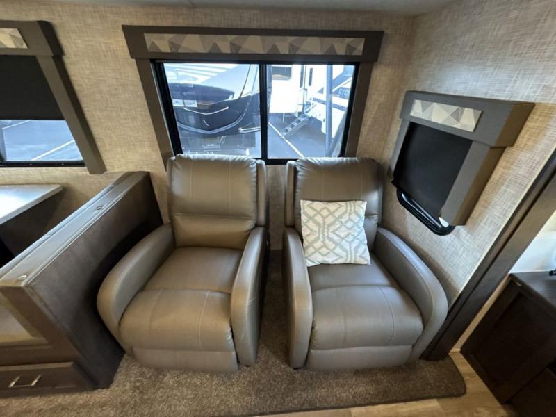 This Salem travel trailer is full of wonderful amenities that will make every trip enjoyable! The large opposing slides are what create an open and spacious environment so that you can sit back on the jiffy sofa, two lounge chairs, or booth dinette while you soak in the ambiance from the fireplace, or you can head outside where you will find two awnings for your protection and a pass-through storage compartment for your gear. Also, the walk-in closet in the front private bedroom will certainly be helpful for storing those extra sweaters and hiking boots