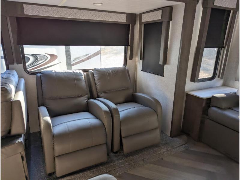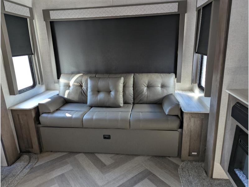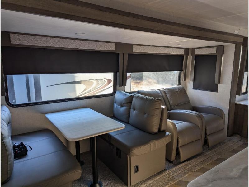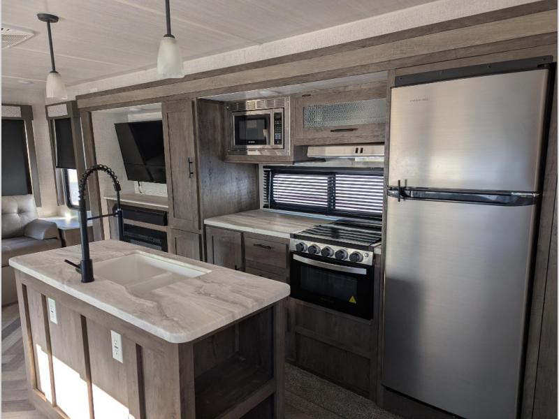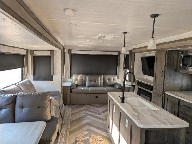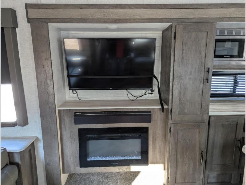 This Salem travel trailer is full of wonderful amenities that will make every trip enjoyable! The large opposing slides are what create an open and spacious environment so that you can sit back on the jiffy sofa, two lounge chairs, or booth dinette while you soak in the ambiance from the fireplace, or you can head outside where you will find two awnings for your protection and a pass-through storage compartment for your gear. Also, the walk-in closet in the front private bedroom will certainly be helpful for storing those extra sweaters and hiking boots