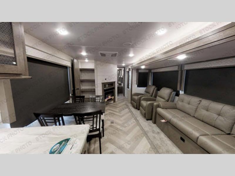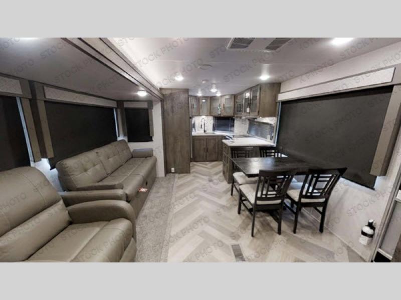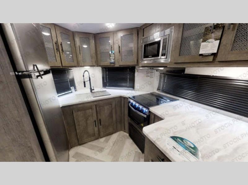 This V-nose Salem travel trailer will be such a delight to have throughout all of your epic journeys! Immediately upon entering you will notice that there is extra space in the main living area because of a large slide that has been included. This slide gives space for comfortable seating like the jiffy sofa with stow-and-go storage underneath and the two lounge chairs, and the best feature of this trailer is certainly the front kitchen. With almost a full 360-degree view, you will love the fact that you can still see what is going on outside while you are inside preparing dinner at the high-output range with oven. After a truly enjoyable day, you will be excited to head back to the rear private bedroom so that you can start another one all over again!