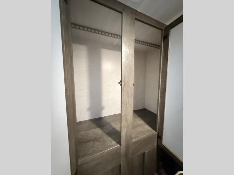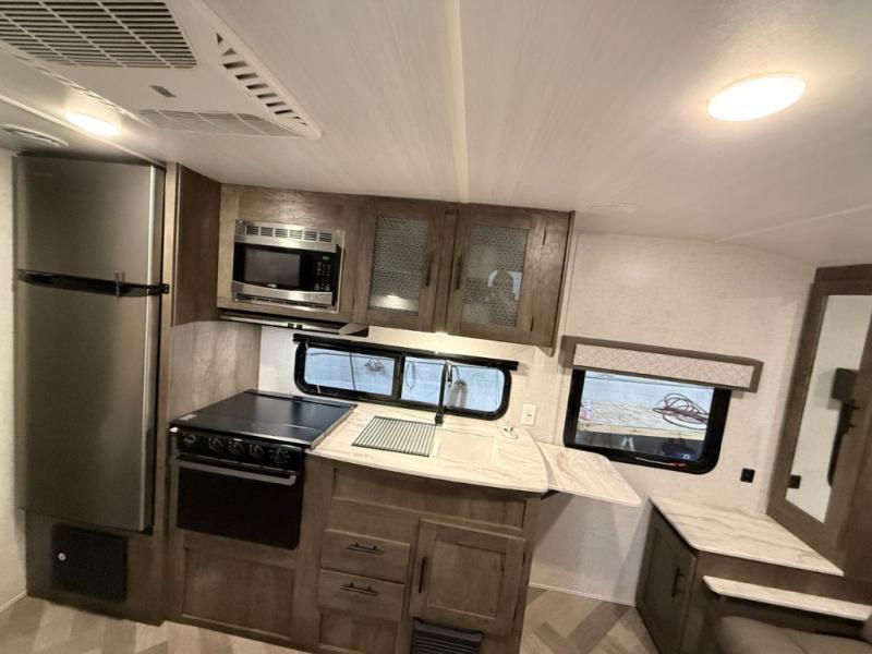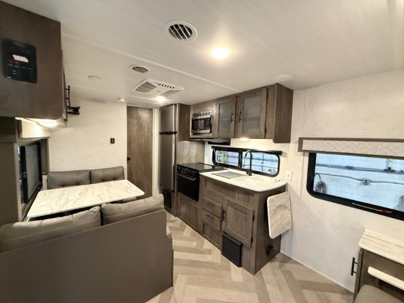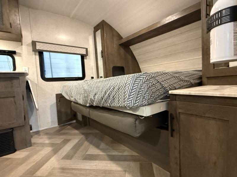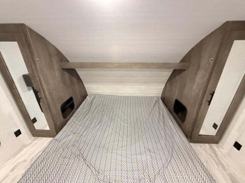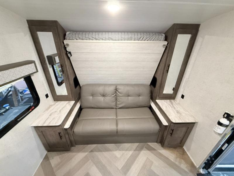 It's time to quickly load up and head out for a fun weekend away from your "To Do" list. You can enjoy a front living area during the daytime with a jiffy sofa and end tables, or a Easy Bed lift system Murphy bed at nighttime that easily stores into the wall when not in use. You can make meals in this galley kitchen and dine at the booth dinette when you aren't outside sitting under the 10' awning. There is also a fold up counter-top area next to the sink for more preparation space. The full rear bath allows you to get cleaned up after a day fishing at the lake, and you'll find a wardrobe and a linen closet to store your towels and necessities.