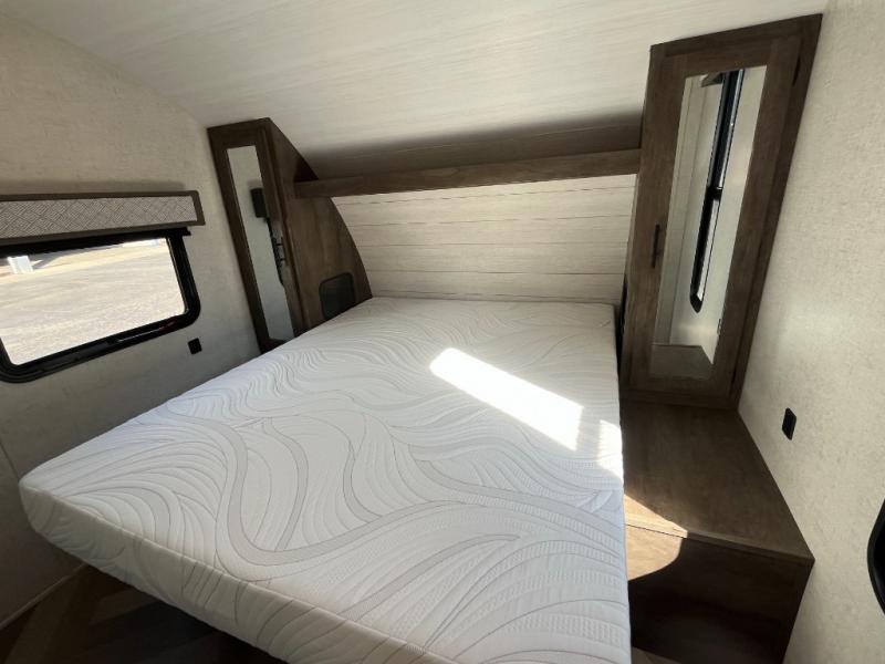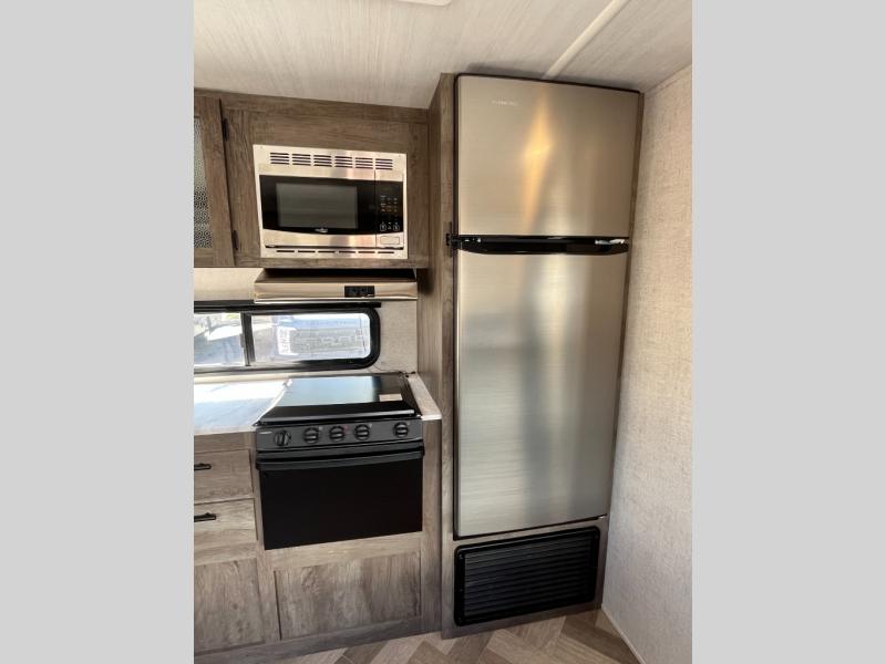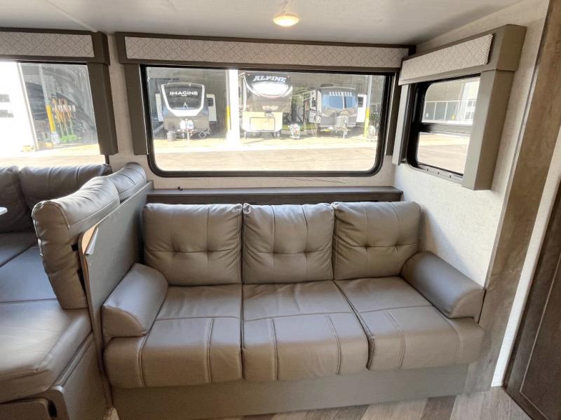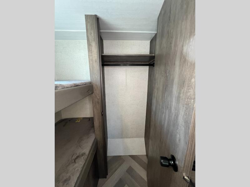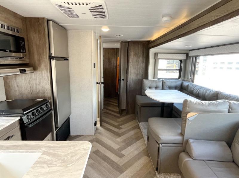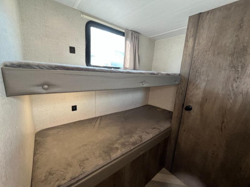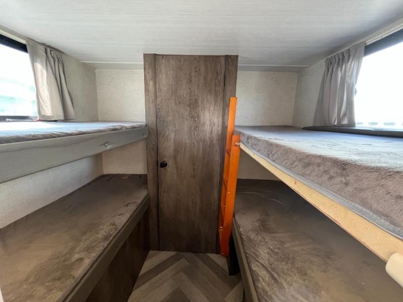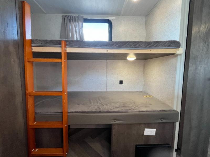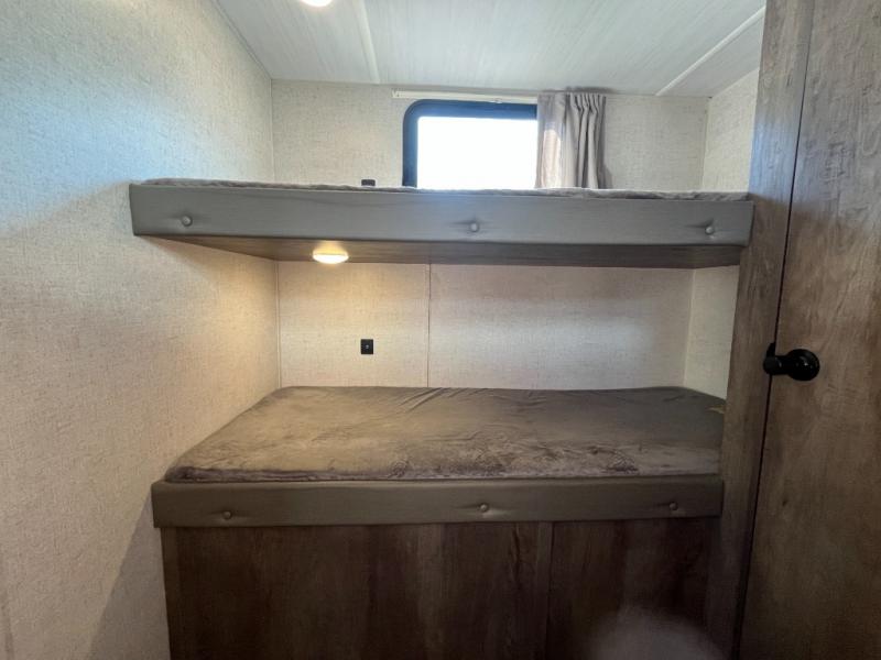 The kids will love having their own space with a private bunkhouse with four bunks included in this travel trailer. You'll find a queen bed in the front private bedroom, and a U-shaped dinette and sofa slide out provide seating for everyone, as well as additional sleeping and floor space. The chef of the family can prepare dinner on the three burner cooktop or make something quick in the microwave. This trailer features plenty of storage throughout, including overhead cabinets and a pantry inside, and outside there is pass through storage for the larger outdoor items like fishing poles, charcoal and such. You might even like to add the optional exterior camp kitchen.