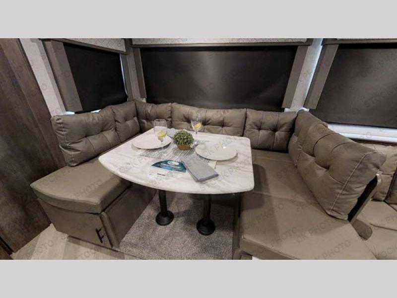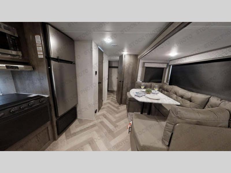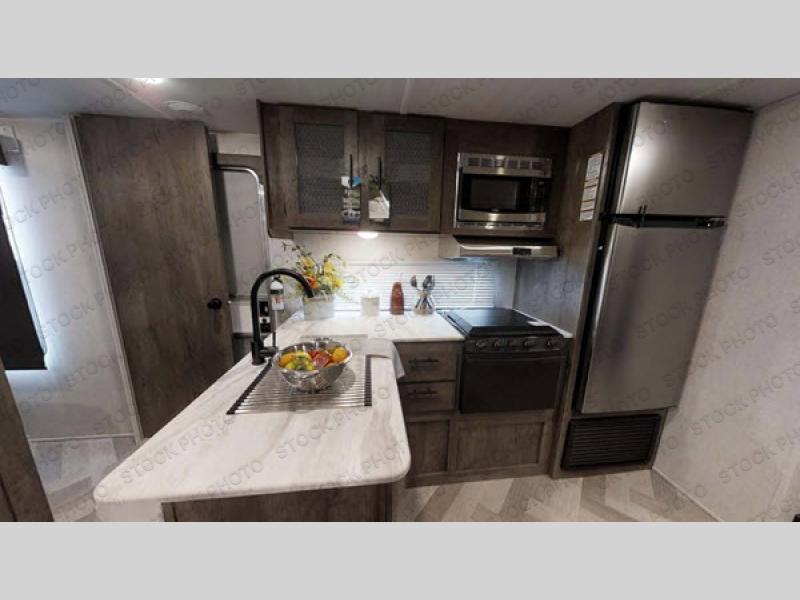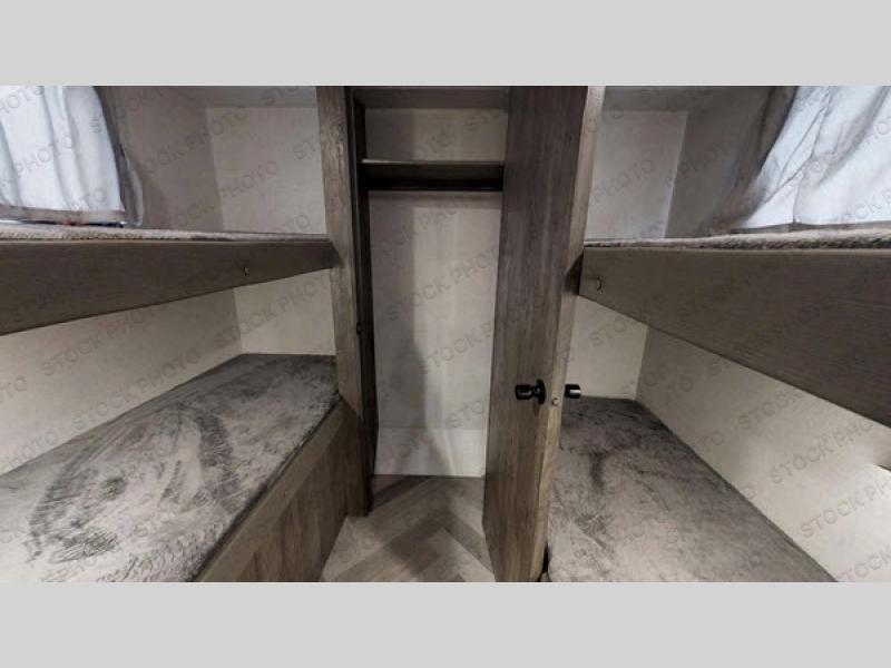 The kids will love having their own space with a private bunkhouse with four bunks included in this travel trailer. You'll find a queen bed in the front private bedroom, and a U-shaped dinette and sofa slide out provide seating for everyone, as well as additional sleeping and floor space. The chef of the family can prepare dinner on the three burner cooktop or make something quick in the microwave. This trailer features plenty of storage throughout, including overhead cabinets and a pantry inside, and outside there is pass through storage for the larger outdoor items like fishing poles, charcoal and such. You might even like to add the optional exterior camp kitchen.