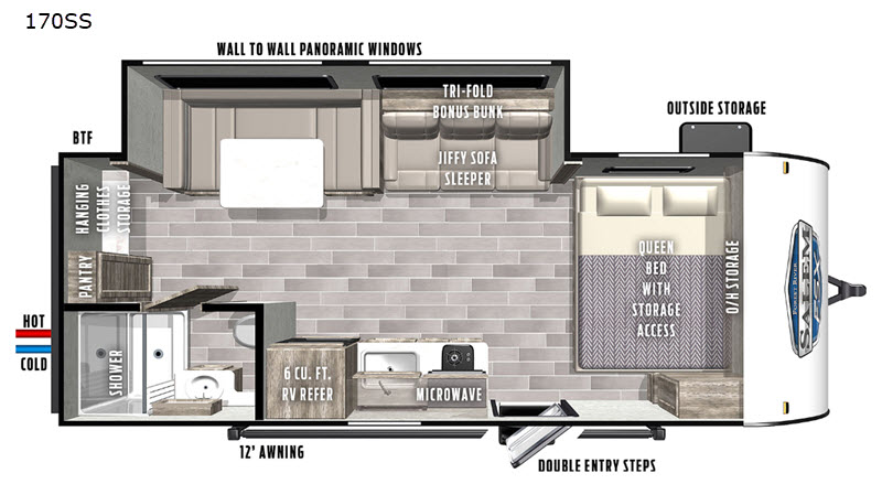 Whether you love to be inside or outside, this trailer has you covered! From the wall to wall panoramic windows giving you lots of natural lighting and great views to having a pantry to carry all your dry goods, you will have lots of space throughout thanks to the large slide out. The cook will have all the appliances needed to make meals, and the U-shaped dinette provides plenty of space to eat meals, play games, and even sleep at night. There is storage for all your things including above the queen bed up front to in the outside compartment. You will even find a bonus bunk stored behind the jiffy sofa, Furrion solar prep and LED mushroom lights, USB charging outlets, and an upgraded appliance package.