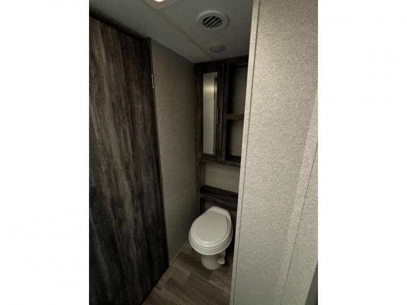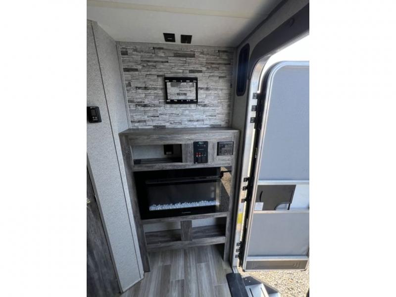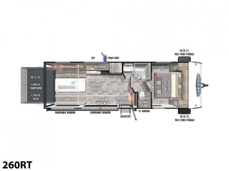 Load up your motorcycles for a weekend of off-road fun in up to 13'4" of cargo space that includes a drive-on wheel well for more space. Once at your destination, you can set up the patio deck on the ramp door, and the 15' full-length power awning with adjustable legs to enjoy the great outdoors and map out your ride. If you prefer some air conditioning, head inside to the two flip-down sofas and removable table that allow you to look out the two panoramic windows without having to be hot. And when it gets too cold, the fireplace is a nice convenience to have. You will soon find that the walk-through bathroom is super convenient, allowing you to enter through the main area or the private bedroom that includes plenty of storage for your clothes and such.