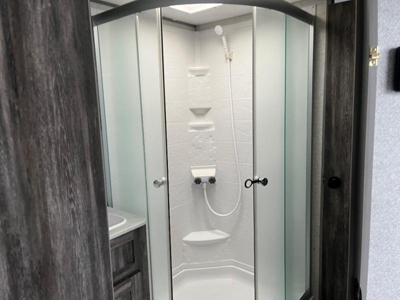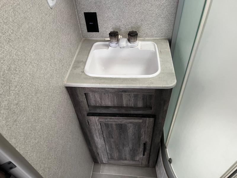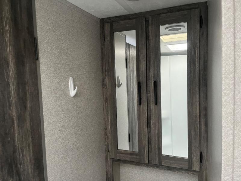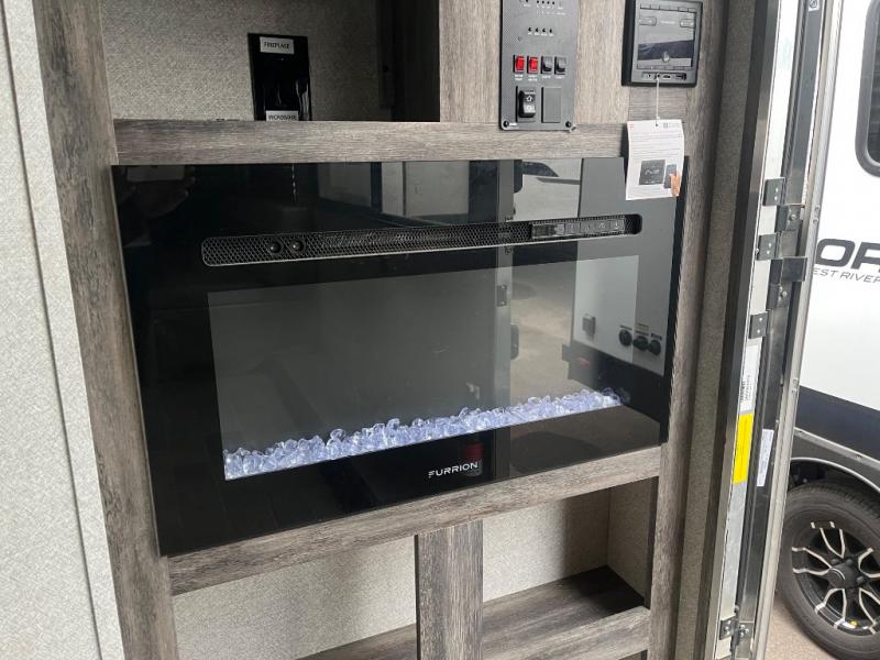 Load up your motorcycles for a weekend of off-road fun in up to 13'4" of cargo space that includes a drive-on wheel well for more space. Once at your destination, you can set up the patio deck on the ramp door, and the 15' full-length power awning with adjustable legs to enjoy the great outdoors and map out your ride. If you prefer some air conditioning, head inside to the two flip-down sofas and removable table that allow you to look out the two panoramic windows without having to be hot. And when it gets too cold, the fireplace is a nice convenience to have. You will soon find that the walk-through bathroom is super convenient, allowing you to enter through the main area or the private bedroom that includes plenty of storage for your clothes and such.