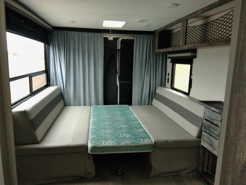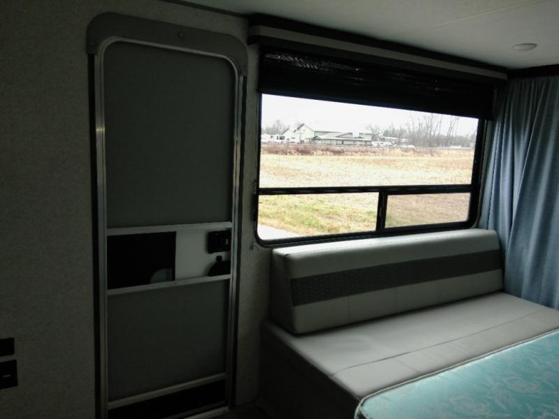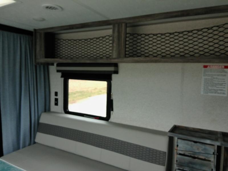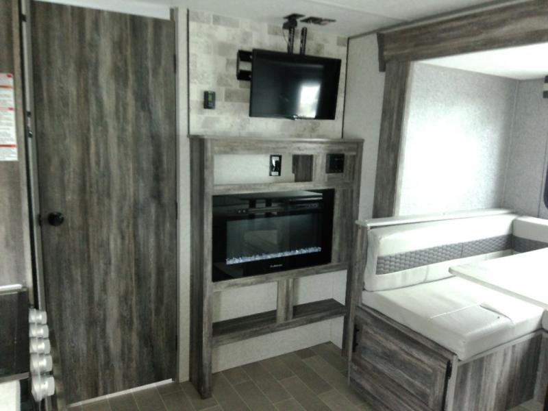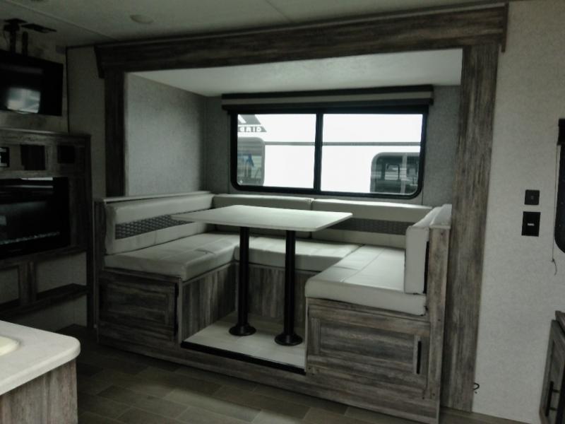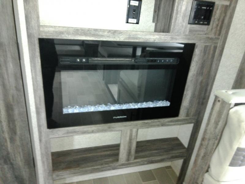 Looking for the ultimate toy hauler with a private cargo area for your toys, plus space for your kids to enjoy their own area at night with two flip-down sofas, a removable table, and a fold-down king bed. They even get to enjoy the views from the panoramic window, and easy access through the second entry/exit door. The walk-through bathroom is convenient having access from the main area and the cargo space. You can cook up your favorite meals with the upgraded appliance package and dine at the U-shaped slide out while enjoying the fireplace and entertainment center. The jiffy sofa allows you to relax inside, and the Murphy bed gives you a comfortable queen mattress to fall asleep on. You will also find USB charging outlets, 56 cu. ft. of pass-through storage along the exterior, and another panoramic window in the slide out. You may like to choose the Platinum package option offering a fiberglass version of this model.