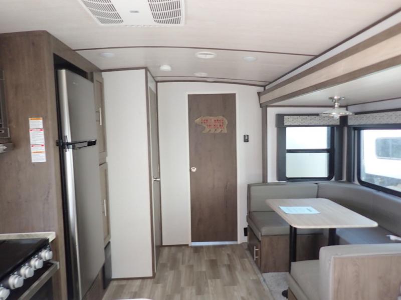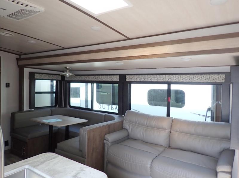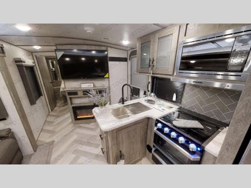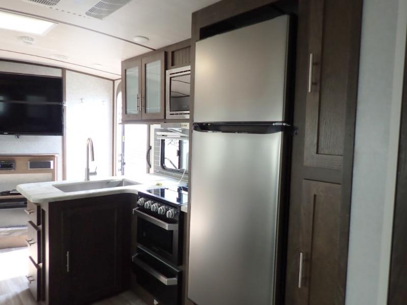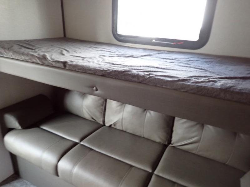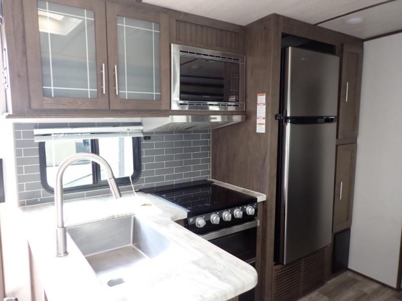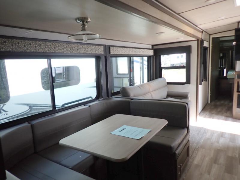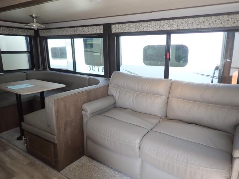 You won't believe all of the luxury features this travel trailer has from the double entry doors and the U-shaped dinette next to a panoramic window to the bath and a half! The chef of your group will love not only cooking indoors with the stainless steel microwave and the large sink, but also outdoors with the outside kitchen/bar so they can breathe in some fresh air while they sip on their favorite drink and grill juicy burgers. The kids will love having their own private bunkhouse with a bunk above a bench and drawers and another bunk above a twin trundle bed, and you will love resting on the queen bed in the front private bedroom. The Texas-sized pass-through storage area is sure to be big enough for your camping gear too!