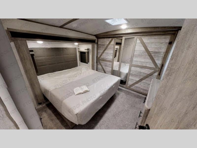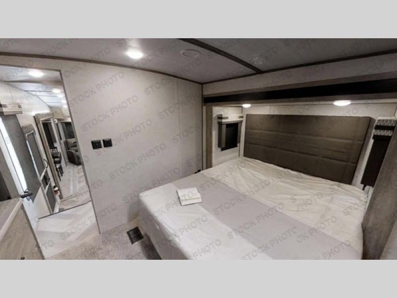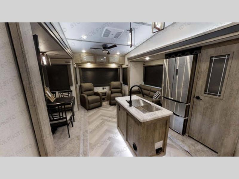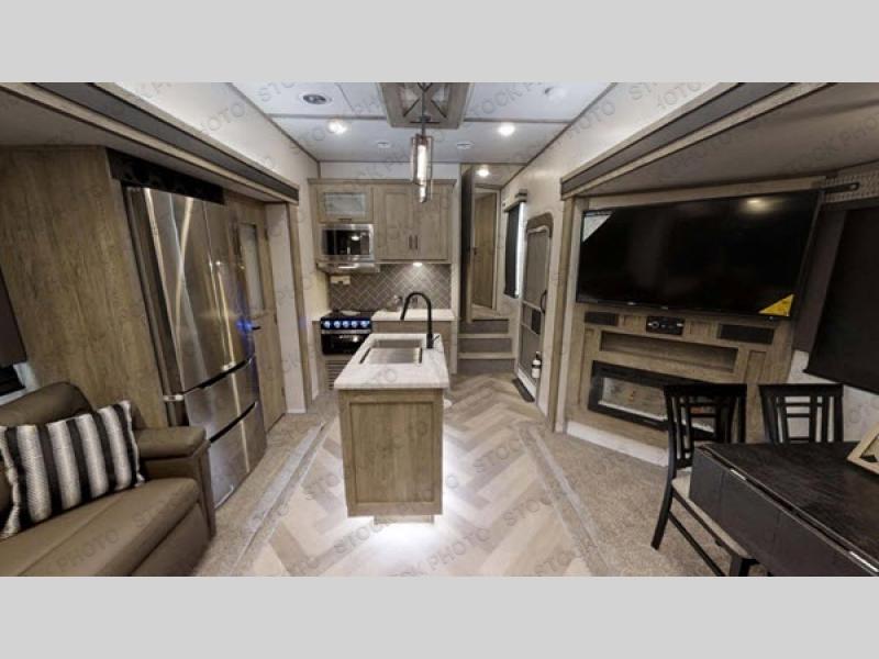 Enjoy the sunshine with panoramic windows throughout this fifth wheel! The rear living area is perfect for relaxing in at night on either the tri-fold sofa, one of the two swivel chairs or play some games at the free standing dinette while a movie is played on the 50" LED TV and a warm fire going in the 32" glass front electric fireplace. The kitchen has an island with a large sink to make clean up easier and a pantry big enough to store everyone's favorite snacks. The full bathroom has a residential walk-in shower with a seat and a skylight above for natural lighting as you get ready. When you're ready to hit the sack, head to the front private bedroom and enjoy a good night's rest on the custom king bed!