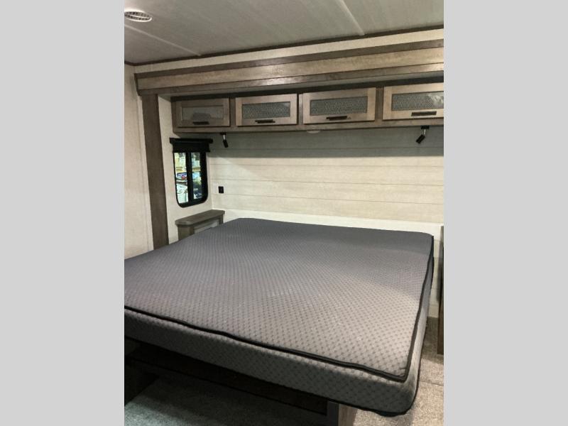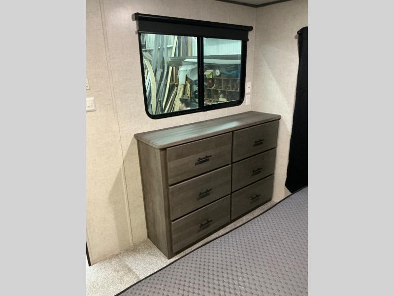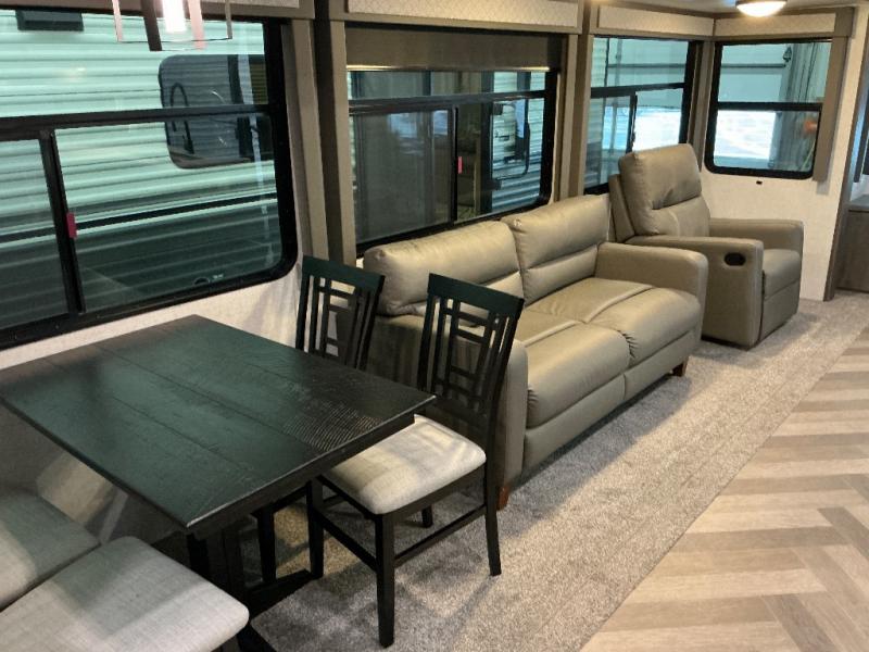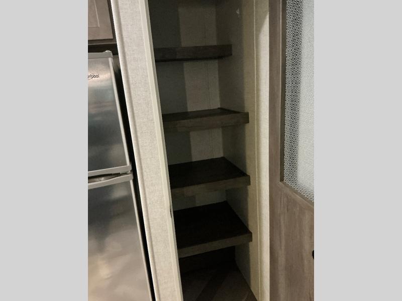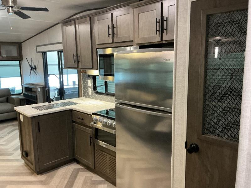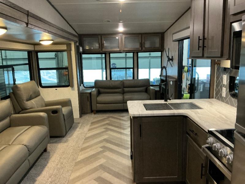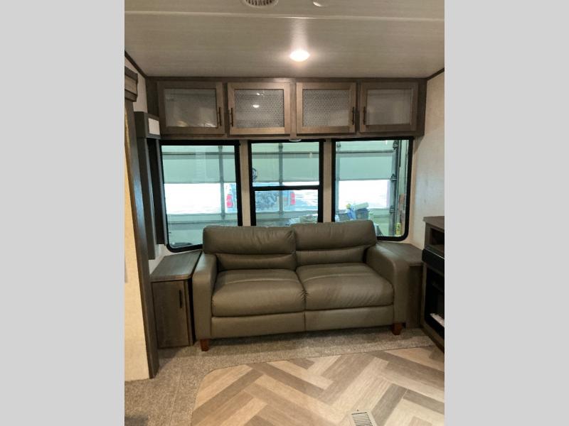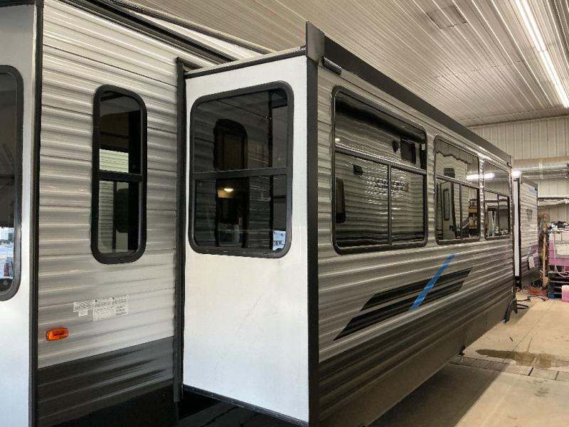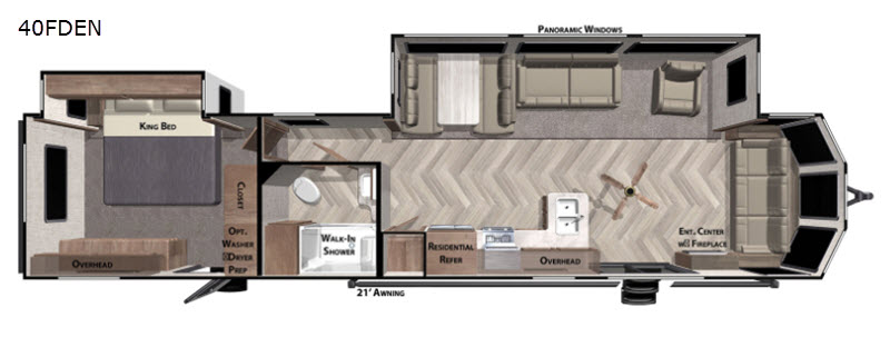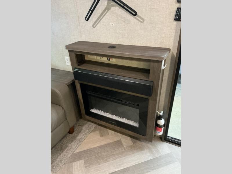 Why not stay a little longer the next time you are at your favorite spot in this trailer! You can sleep in late on your own king-size bed slide while washing your clothes in the optional washer/dryer if you added those appliances. You can also gaze out the many windows looking at the scenery before getting up to head outside the second entry/exit door for a walk or to sit under the 21' awning. Or you might decide to get cleaned up in the full bathroom with a walk-in shower. The cook will love the kitchen layout with an L-shaped counter, a pantry and all the appliances needed for warm or cold meals. The large slide in the living area gives you more floor space and panoramic windows plus the bay front includes lots of windows for more natural light and great views. The ceiling fan will keep every cool and the fireplace can keep everyone warm, it all depends which season you are in.