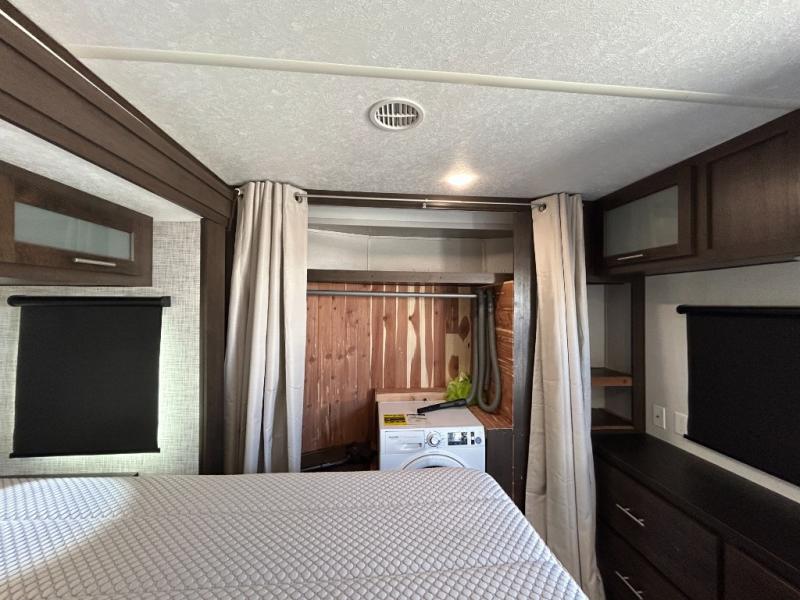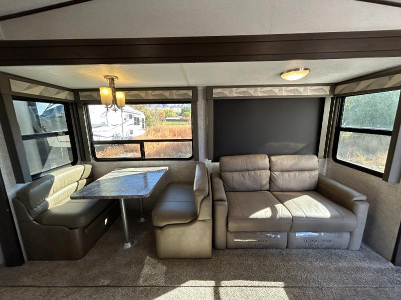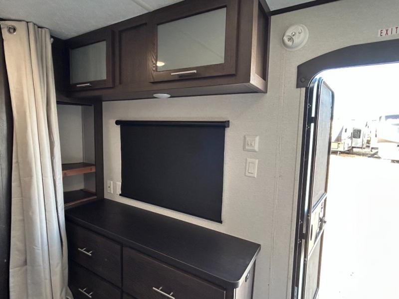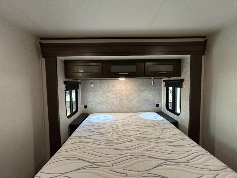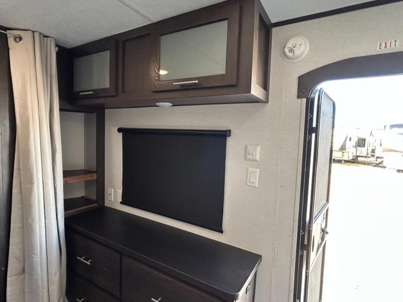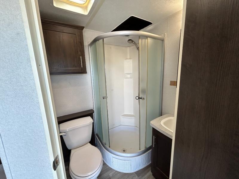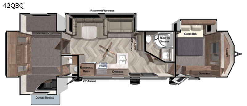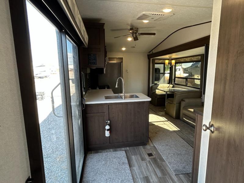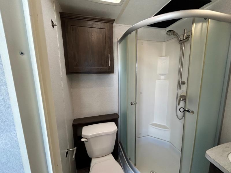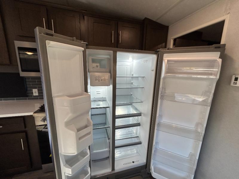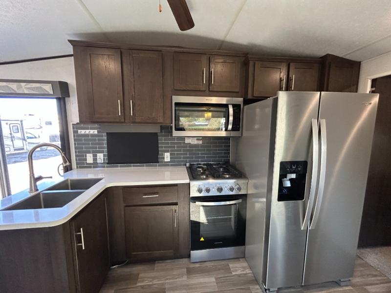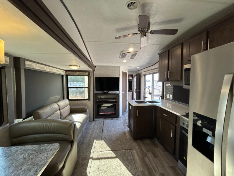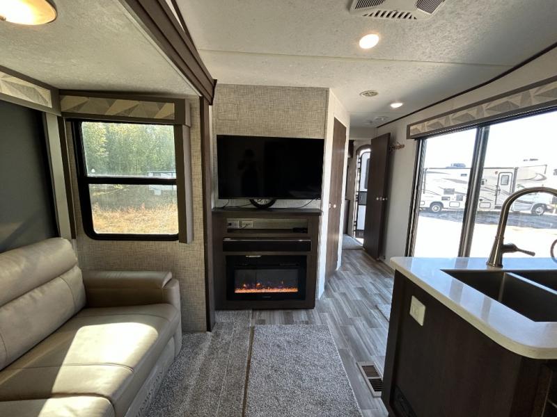 Spend your weekends sleeping on your own queen-size bed in the private bedroom of this trailer while your guests or children spend their time in their very own bunkhouse suite that has opposing bunk bed slides, and its own half bathroom with a private entry/exit door. The kitchen provides the necessary amenities such as a three-burner stove, an over-sized microwave, and a double-basin undermount sink. The residential refrigerator will store all your leftovers as well. You can dine, play games and even sleep on the U-shaped dinette, and the sofa offers another spot to relax. On top of all of that, you will also be able to unwind in front of the fireplace each night before drifting off to sleep and starting the adventure all over again tomorrow.