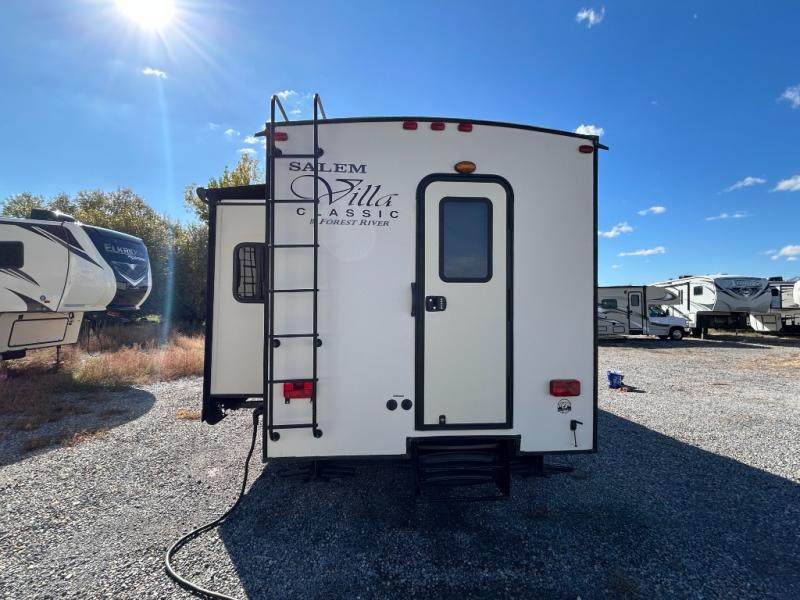 Each Salem Villa Series Classic destination trailer by Forest River is built on a cambered chassis with a seamless one piece roof, fiberglass insulation throughout, , 74" tall slide outs, and 84" interior height for lots of head room. Inside you will love the Herringbone pattern luxury vinyl flooring, the smooth finish ceiling panels, the modern wall board, the rustic wood grain, and many more "must have" features throughout. Choose the model that fits your home away from home dreams, and start living in serenity!