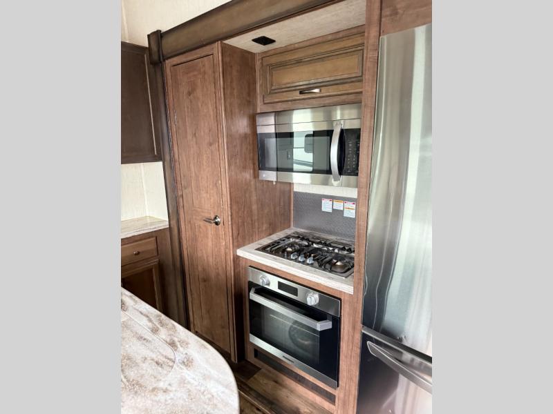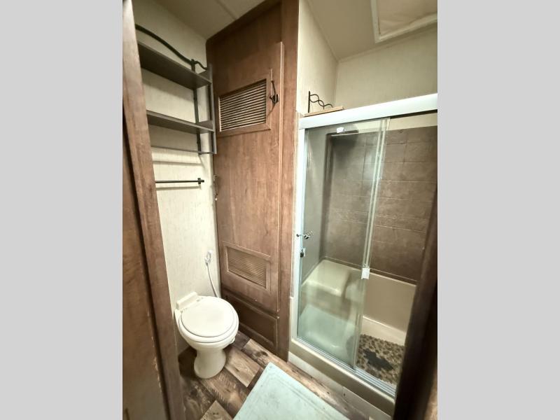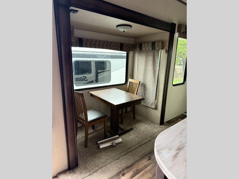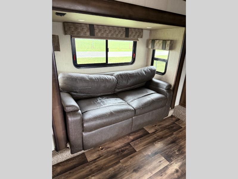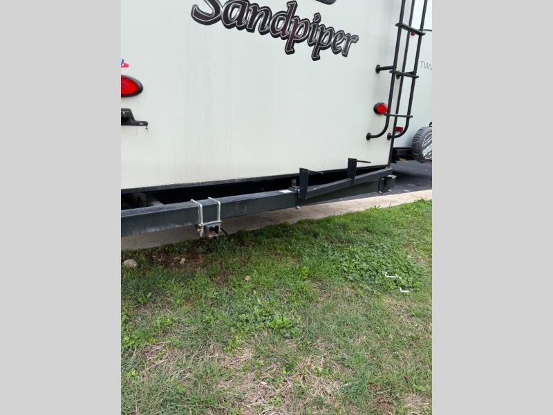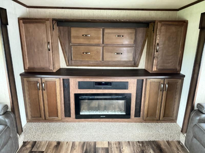 Get ready to camp in comfort when you choose to camp in this Sandpiper fifth wheel by Forest River. This model features sleeping space for up to six people with a rear queen bed and two tri-fold hide-a-bed sofas in the front living area. Along the front of this unit there is an entertainment center where you can watch a movie on rainy afternoons with the 50" LED HDTV as you snuggle up next to the fireplace. With two entry doors, you can easily enter this unit and be in the kitchen area, or you can enter through the rear door and have easy access to the bathroom. The exterior kitchen is ideal for storing drinks or snacks so that you can grab them quickly while you are playing outside with the kids.