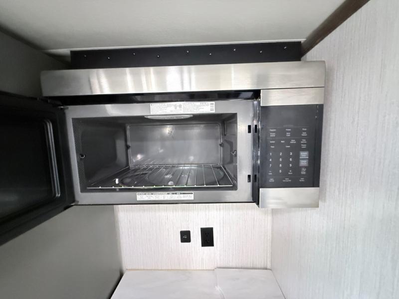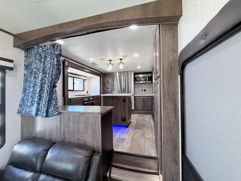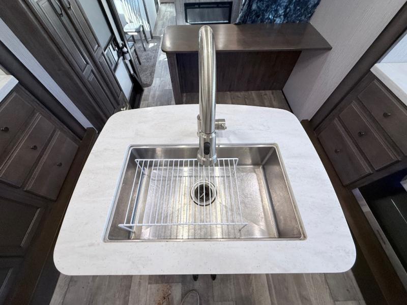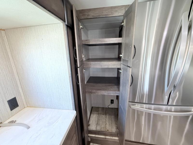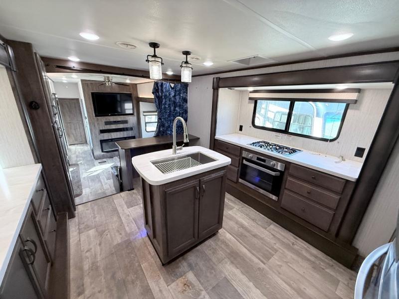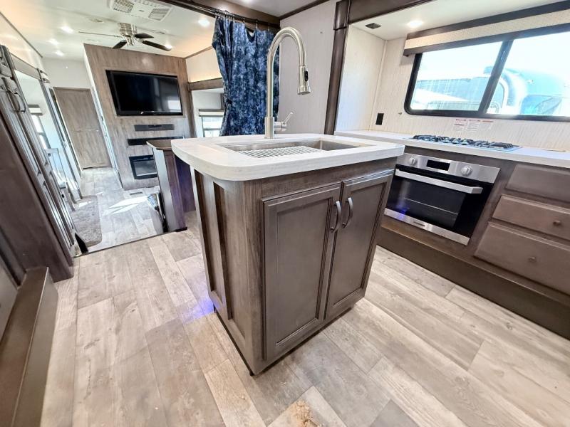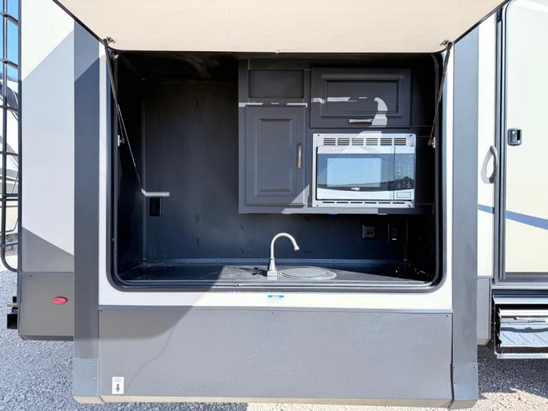 Get ready for more family time and new experiences when you choose to camp with this six-slide Sandpiper fifth wheel. Where are you going to make dinner tonight? That is the question you will be asking yourself when you see this unit. The exterior kitchen allows more time outdoors with your family and features a refrigerator and microwave. The unique front kitchen is spacious and accommodating with opposing slides, an island, and a dinette with two chairs. In the spacious bathroom is a large walk-in shower with a seat, plus a closet that has been prepped for a washer and dryer. With two entry doors into this model, you can easily slip out the rear door and head out for an early morning fishing trip!
