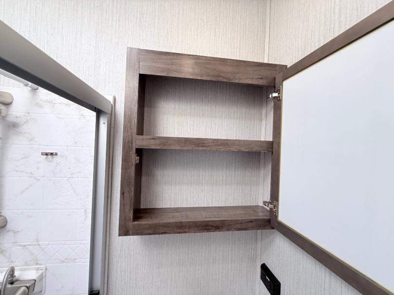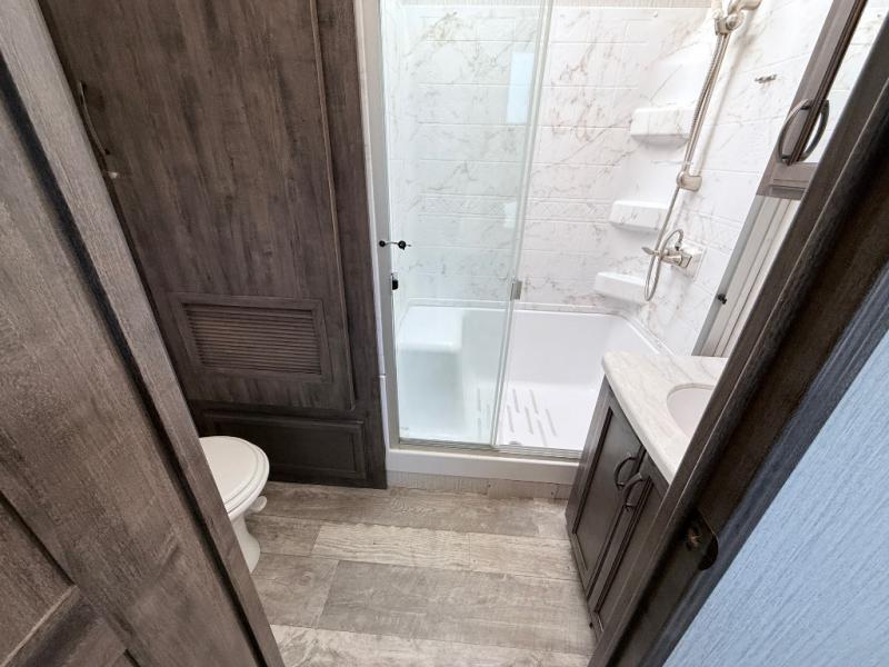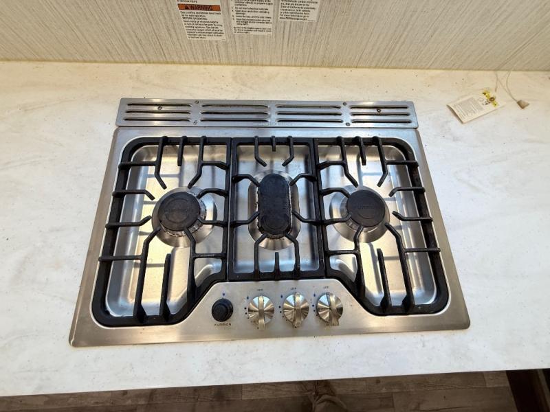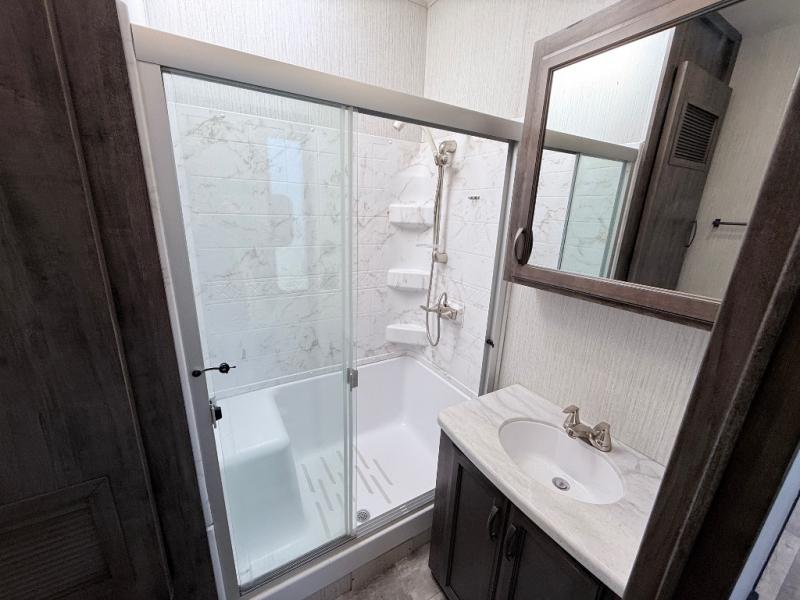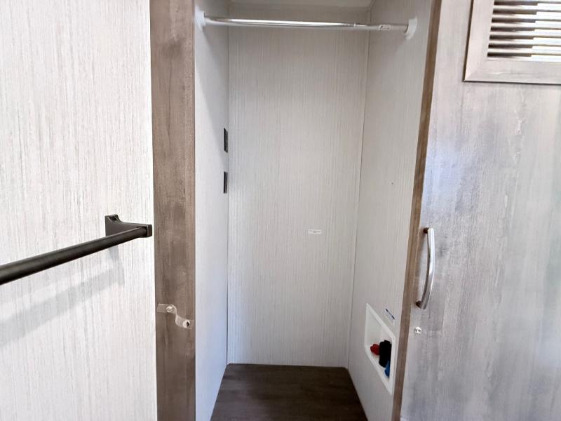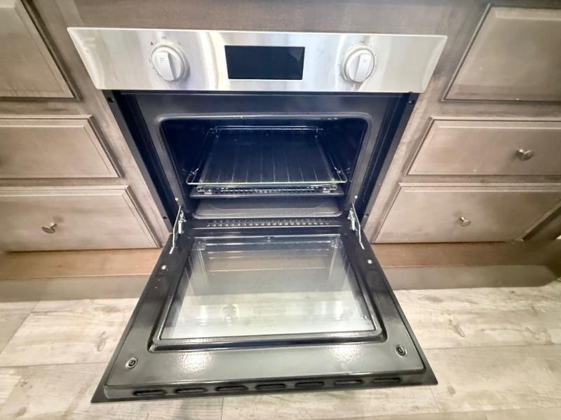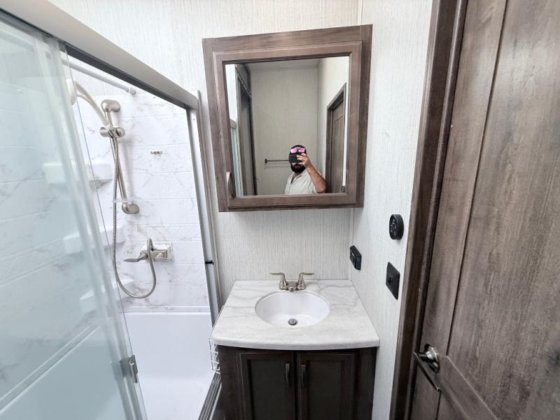 Get ready for more family time and new experiences when you choose to camp with this six-slide Sandpiper fifth wheel. Where are you going to make dinner tonight? That is the question you will be asking yourself when you see this unit. The exterior kitchen allows more time outdoors with your family and features a refrigerator and microwave. The unique front kitchen is spacious and accommodating with opposing slides, an island, and a dinette with two chairs. In the spacious bathroom is a large walk-in shower with a seat, plus a closet that has been prepped for a washer and dryer. With two entry doors into this model, you can easily slip out the rear door and head out for an early morning fishing trip!