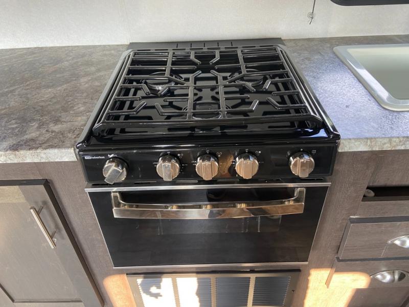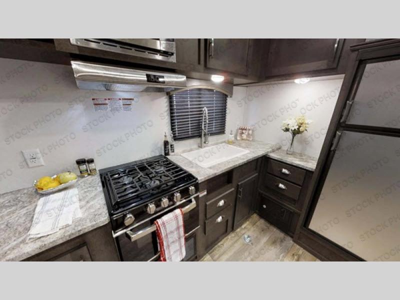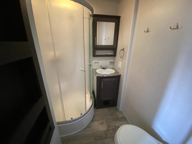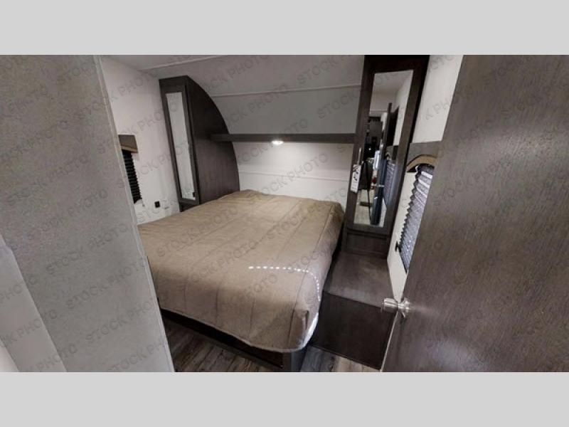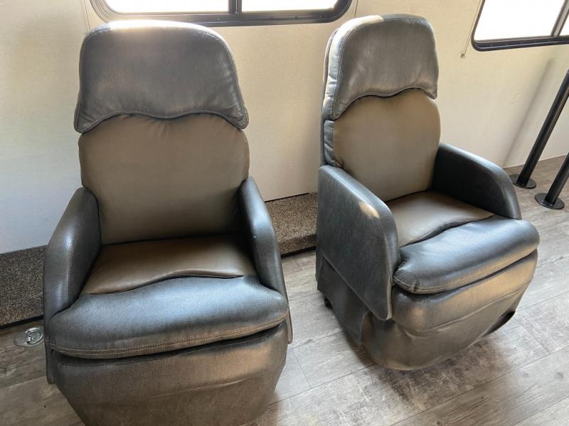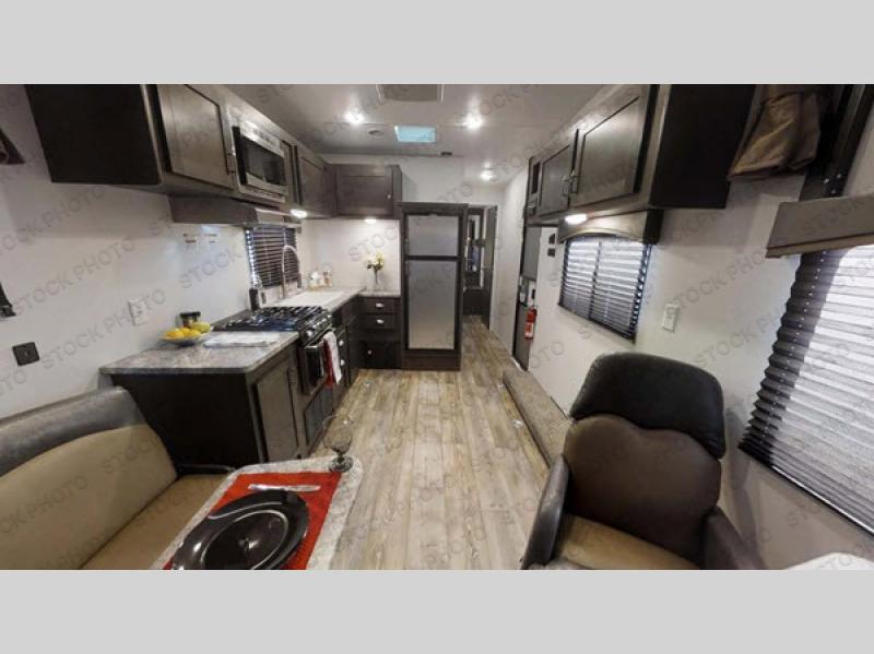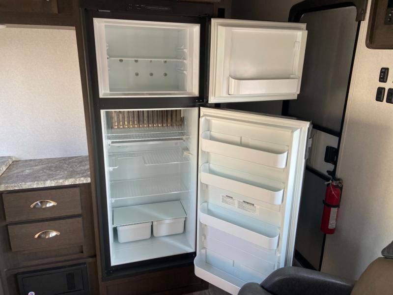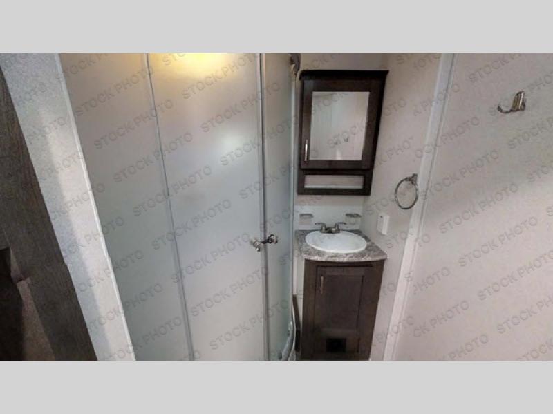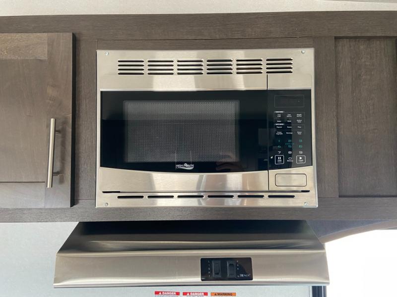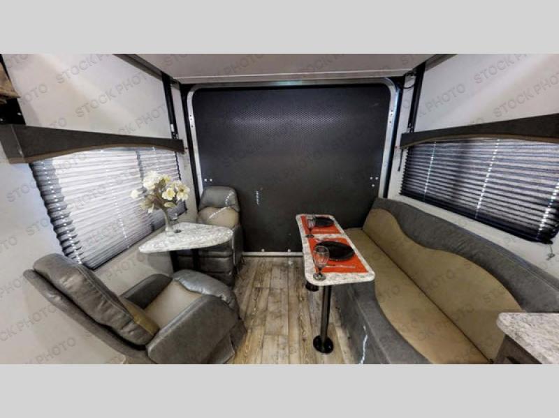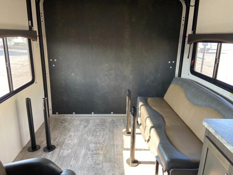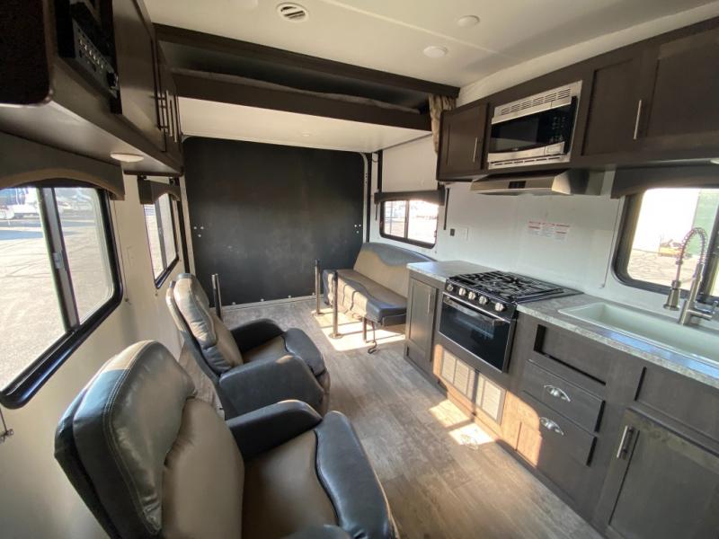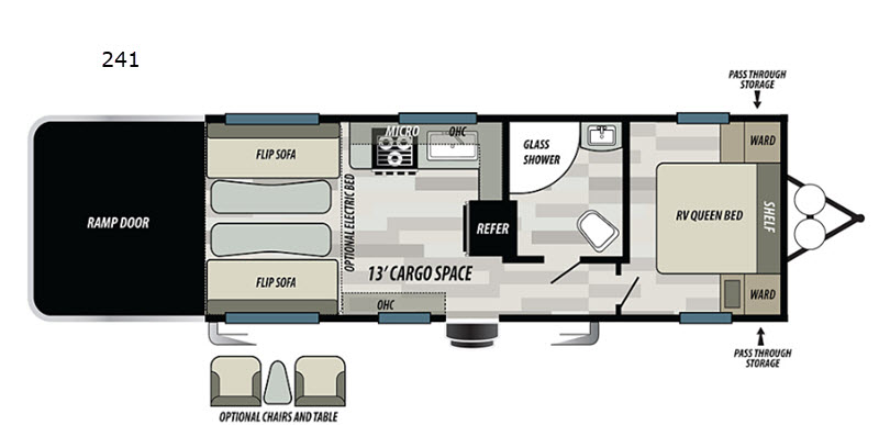 This toy hauler will be perfect for your weekend getaway at your local state park. You can unload your four wheelers by using the 3,000 lb. radius ramp door, then hit the trails for some fun. You'll appreciate the full bath once you return to clean up in the glass radius shower and the three burner cooktop will allow you to prepare dinner. This unit also includes a front private bedroom with an RV queen bed that has wardrobes on either side for your clothes, and dual opposing sofas in the rear.